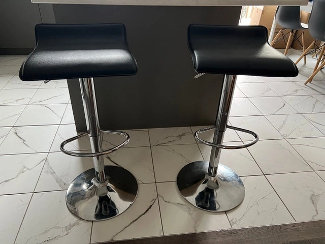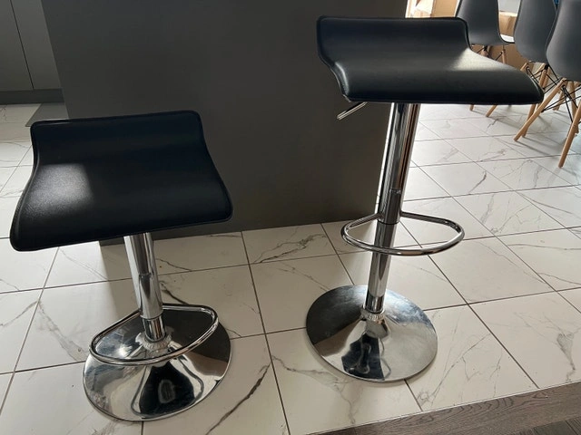 Selling a set of 2 modern adjustable bar stools with black seats and chrome bases. They have a clean look and are comfortable, great for a kitchen island or bar setup.