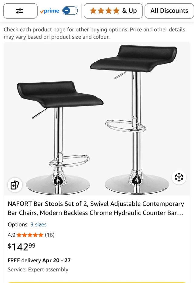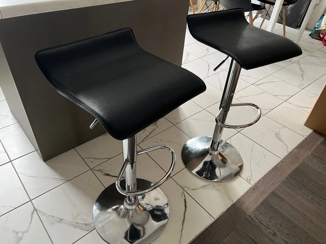 Selling a set of 2 modern adjustable bar stools with black seats and chrome bases. They have a clean look and are comfortable, great for a kitchen island or bar setup.