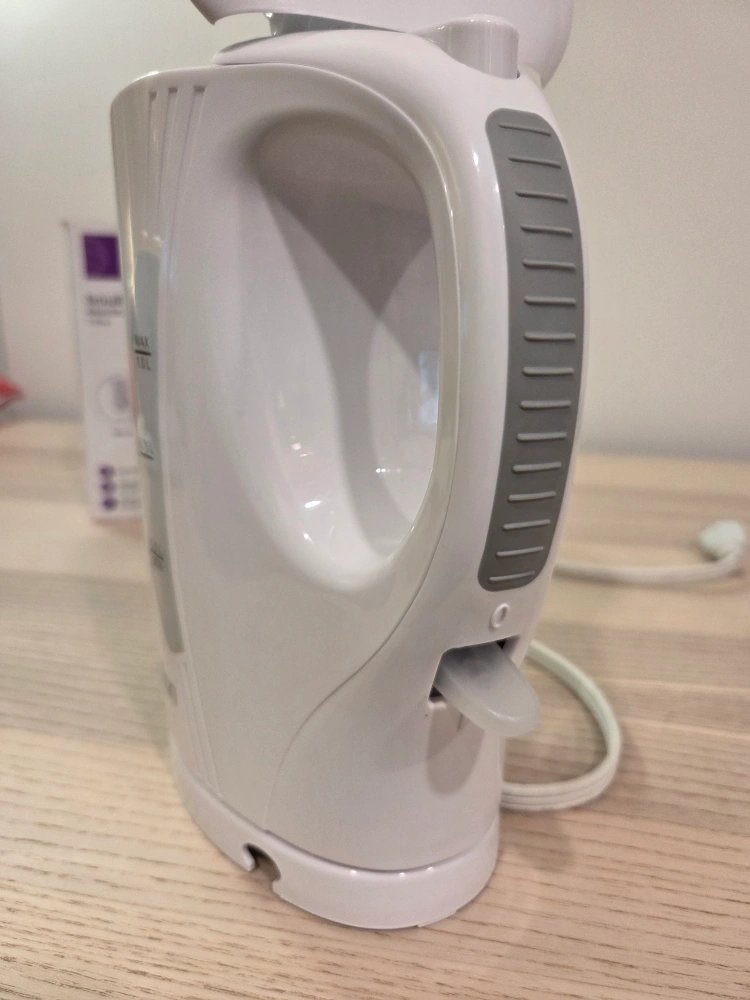 This is a white Salton compact electric kettle with a 1-litre capacity. It has a water level indicator and a concealed heating element. It's perfect for quickly boiling water for tea, coffee, or other hot beverages.