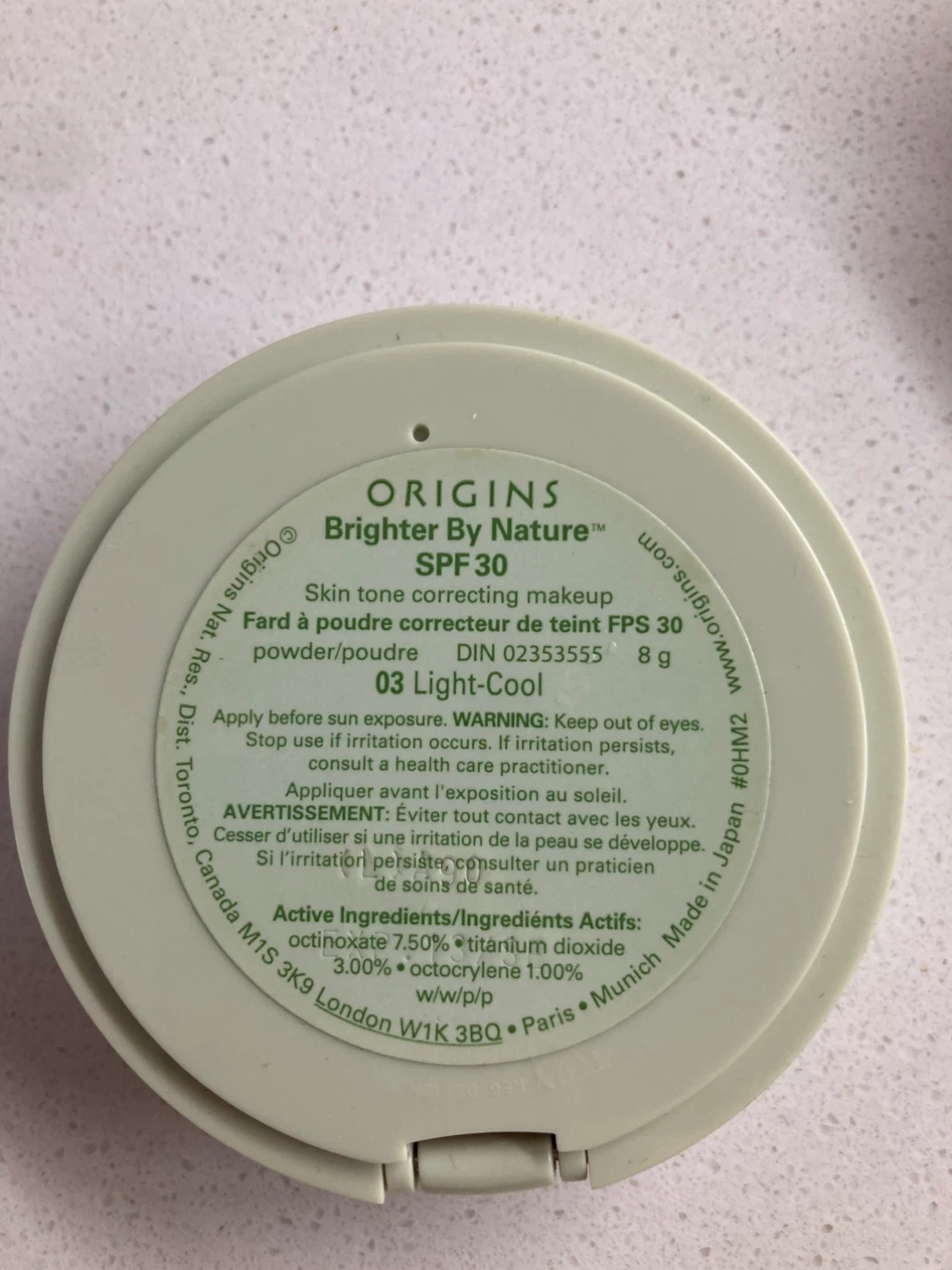 This is Origins Brighter By Nature Skin Tone Correcting Makeup with SPF 30. It's the Light-Cool shade and comes in an 8g compact. The powder formula provides coverage and sun protection.