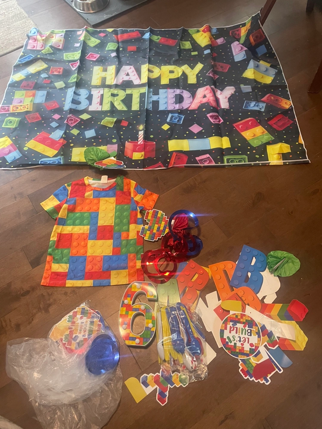 Selling a Lego-themed birthday party decoration set! Includes a Happy Birthday backdrop, a Lego-themed shirt, number '6' decoration, balloons, and other decorative pieces. Perfect for a Lego-loving kiddo's 6th birthday party