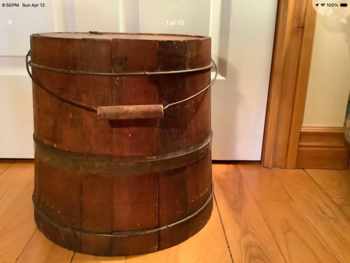 Large antique staved wood lidded firkin bucket from “The Mohican Stores Inc. Watertown, New York.”