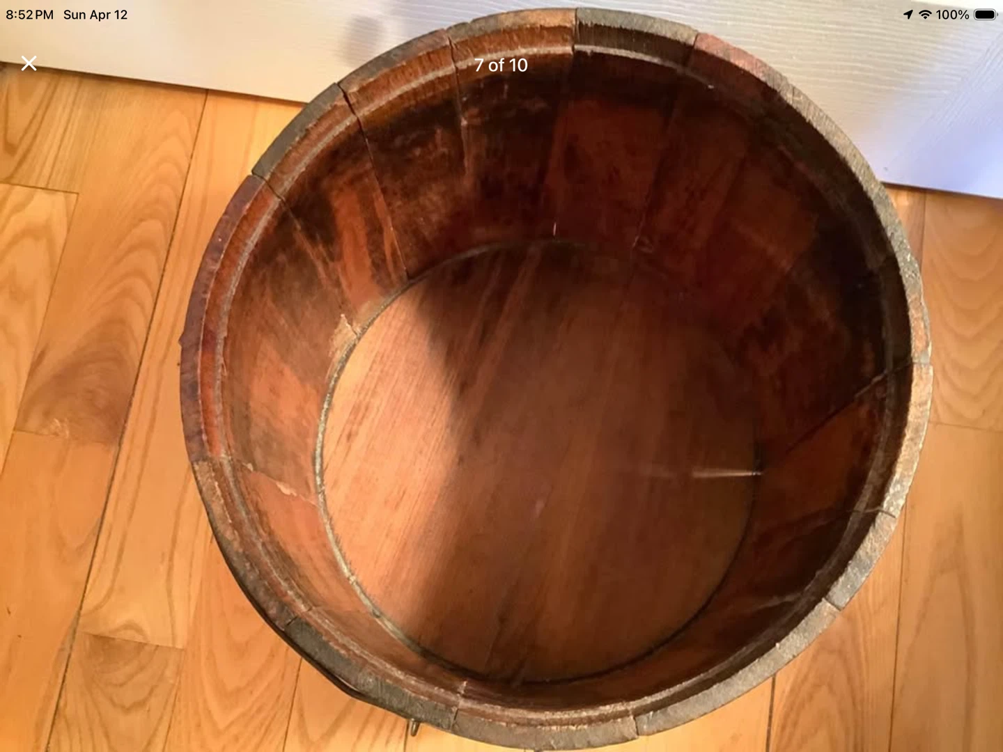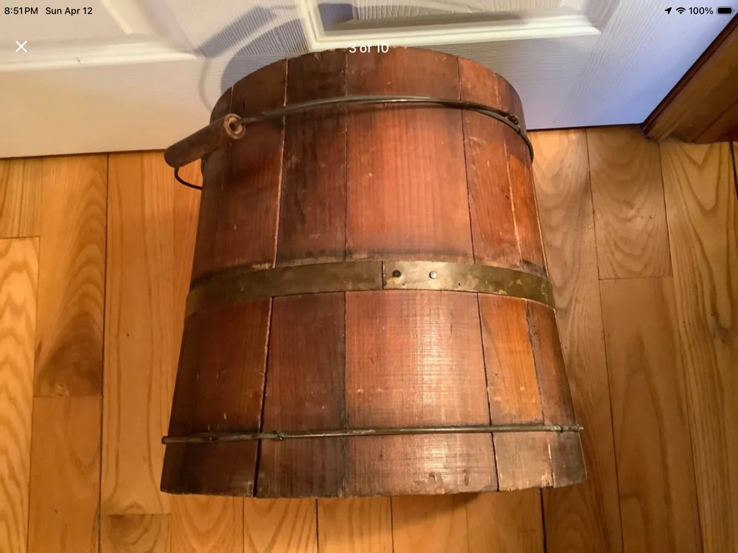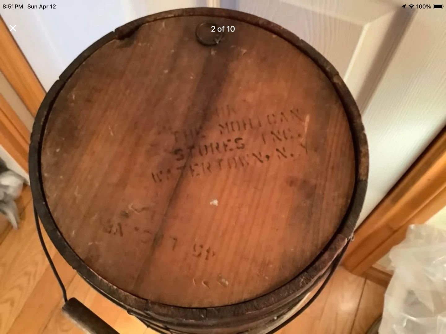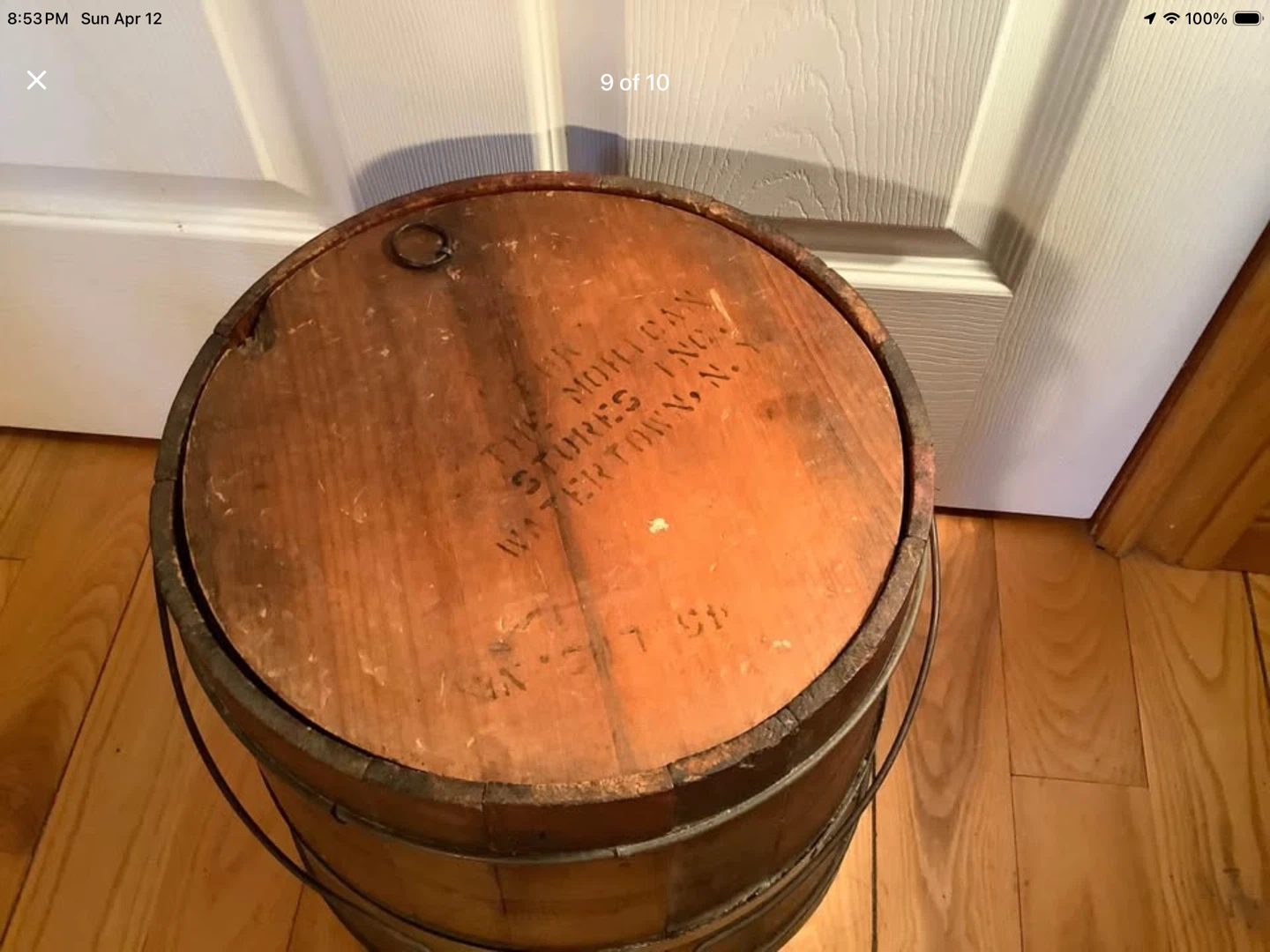 Large antique staved wood lidded firkin bucket from “The Mohican Stores Inc. Watertown, New York.”