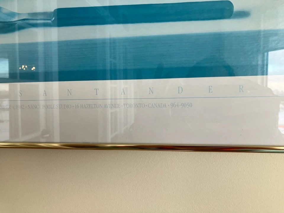 Cool framed art print with a still life scene featuring African violets, a coffee cup, spoon, and an egg, all in blue tones. It has a gold-colored metal frame and measures about 29.5 inches wide and 24 inches tall. Looks like it's from a 1982 exhibition.