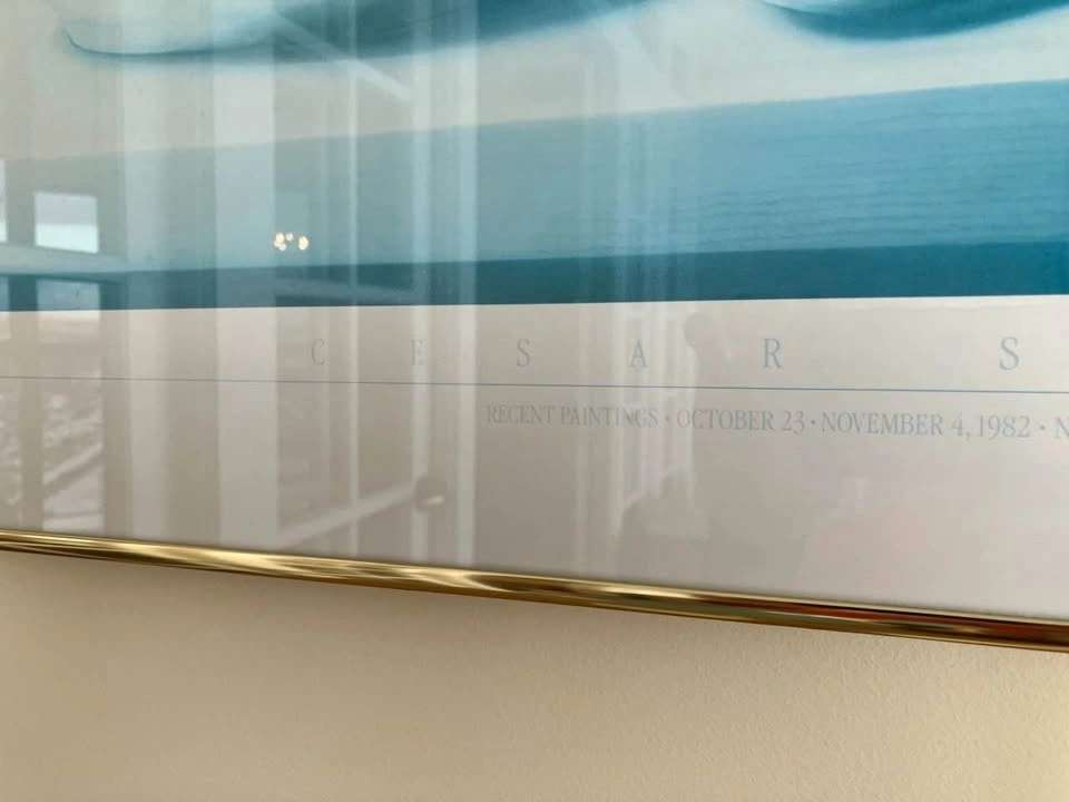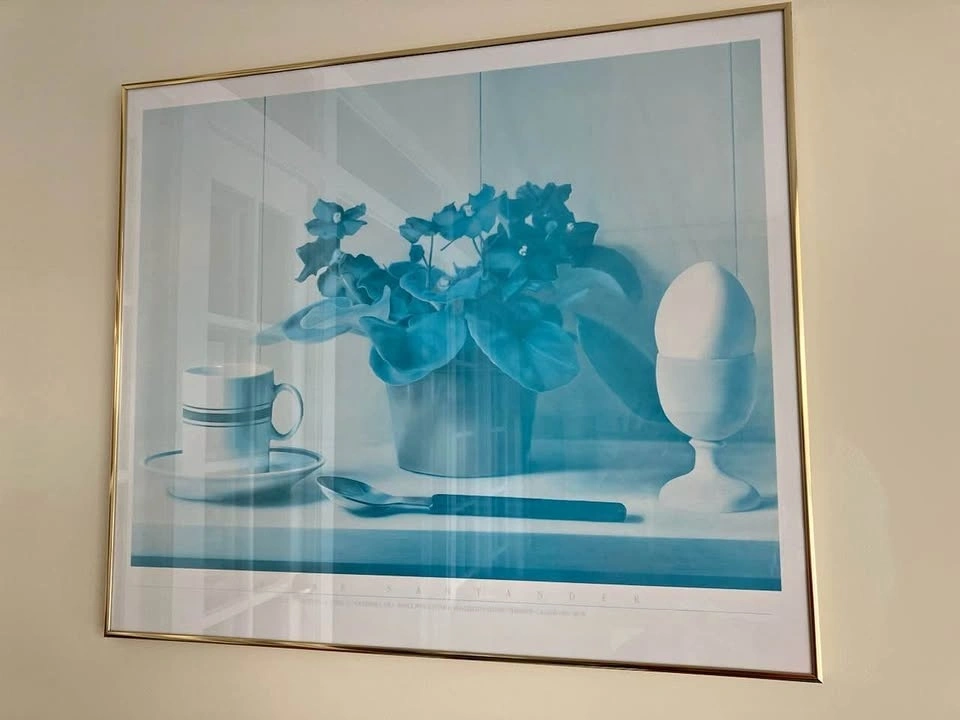 Cool framed art print with a still life scene featuring African violets, a coffee cup, spoon, and an egg, all in blue tones. It has a gold-colored metal frame and measures about 29.5 inches wide and 24 inches tall. Looks like it's from a 1982 exhibition.
