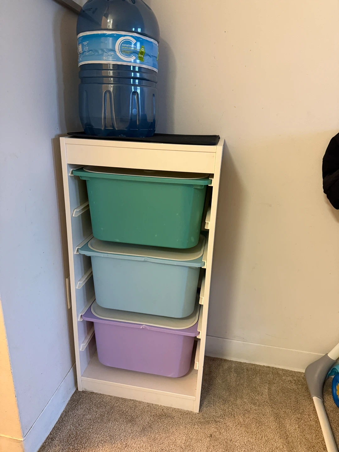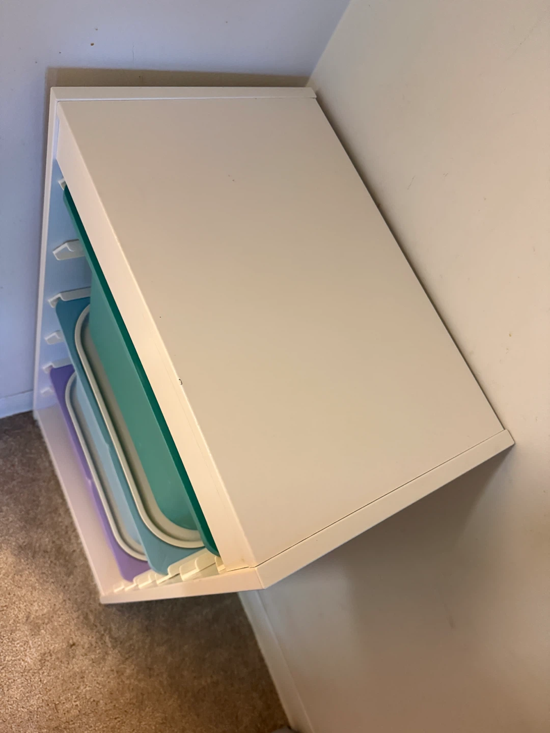 This IKEA TROFAST storage combination comes with three colourful plastic boxes in green, light blue, and purple. It's a handy unit for organizing toys or other items. The unit's dimensions are 46x30x94 cm.