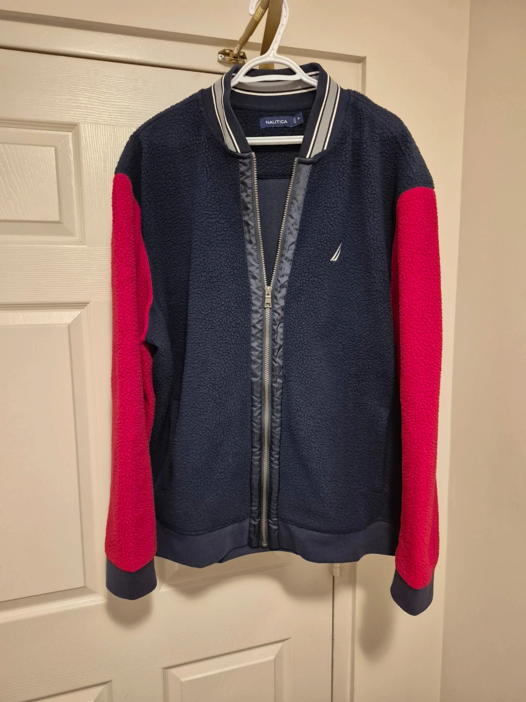 Cozy Nautica fleece bomber jacket in XL. It's a navy blue body with bright red sleeves and a striped collar. Features a full zip front and two side pockets.