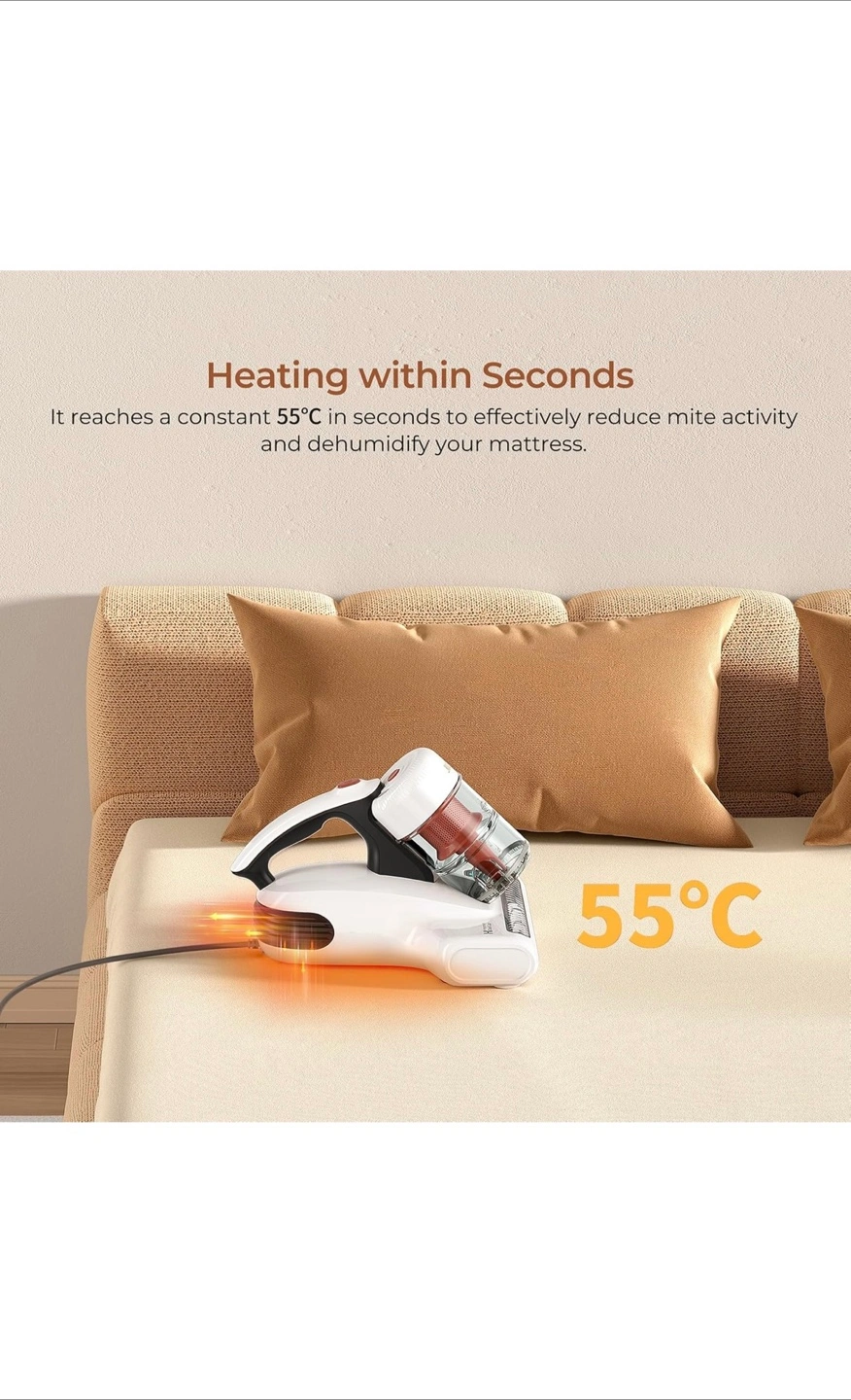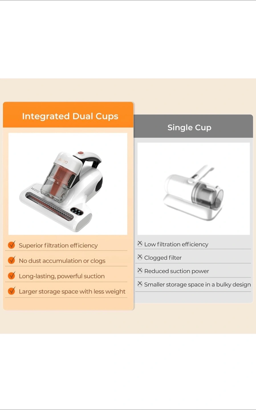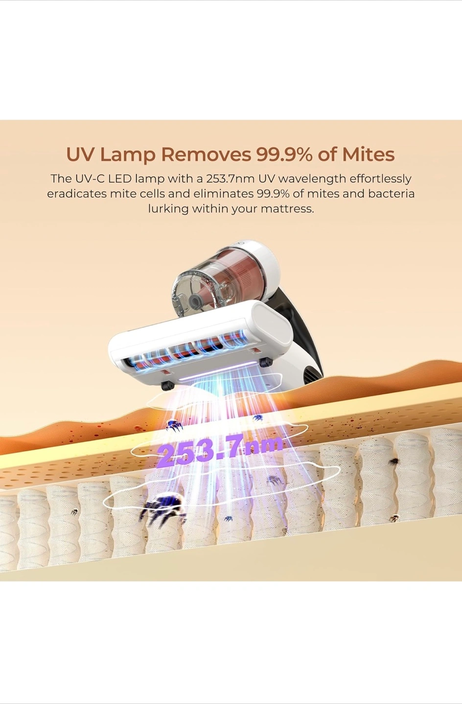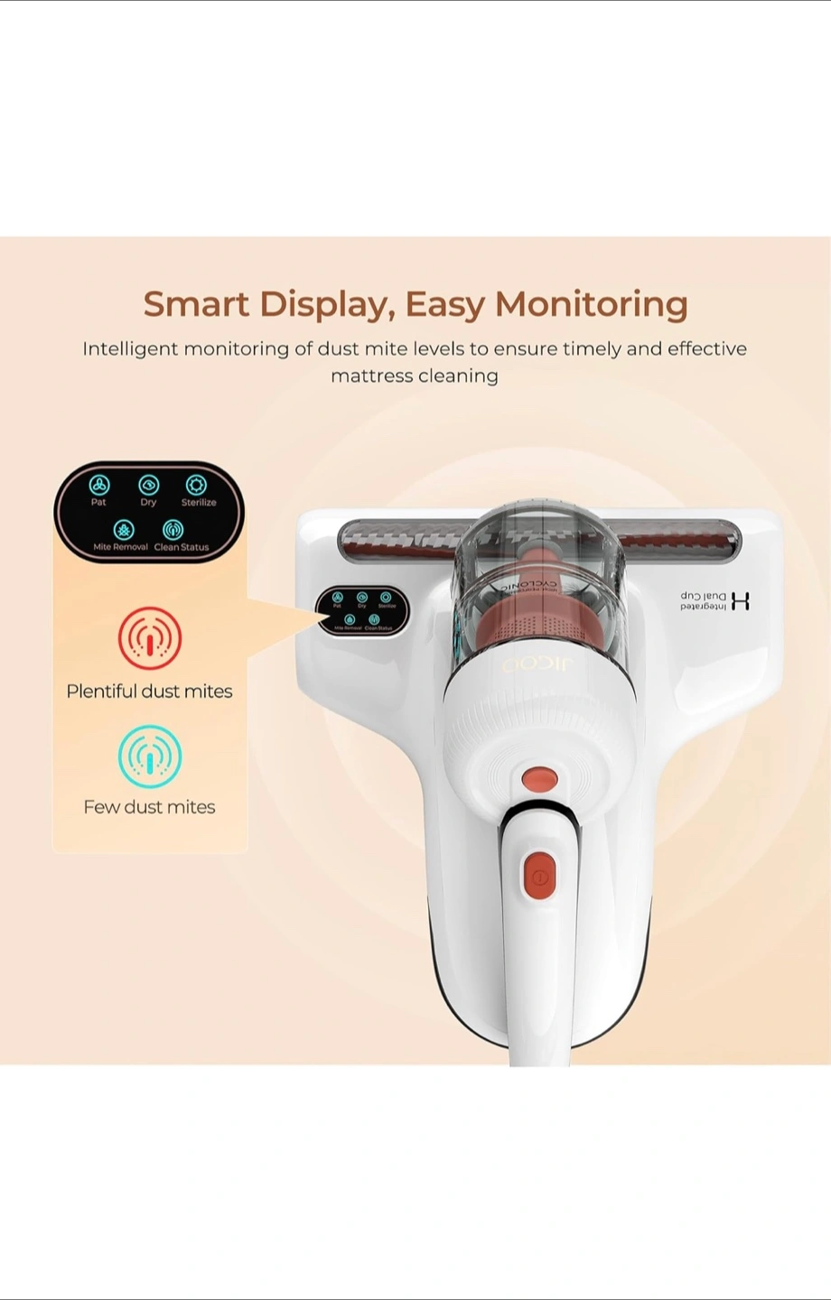 Lightweight cordless vacuum cleaner. Features dual dust cups and UV lamp for mite removal. Includes multiple settings for various cleaning tasks. Patented integrated dual cup system. Smart display for easy monitoring.