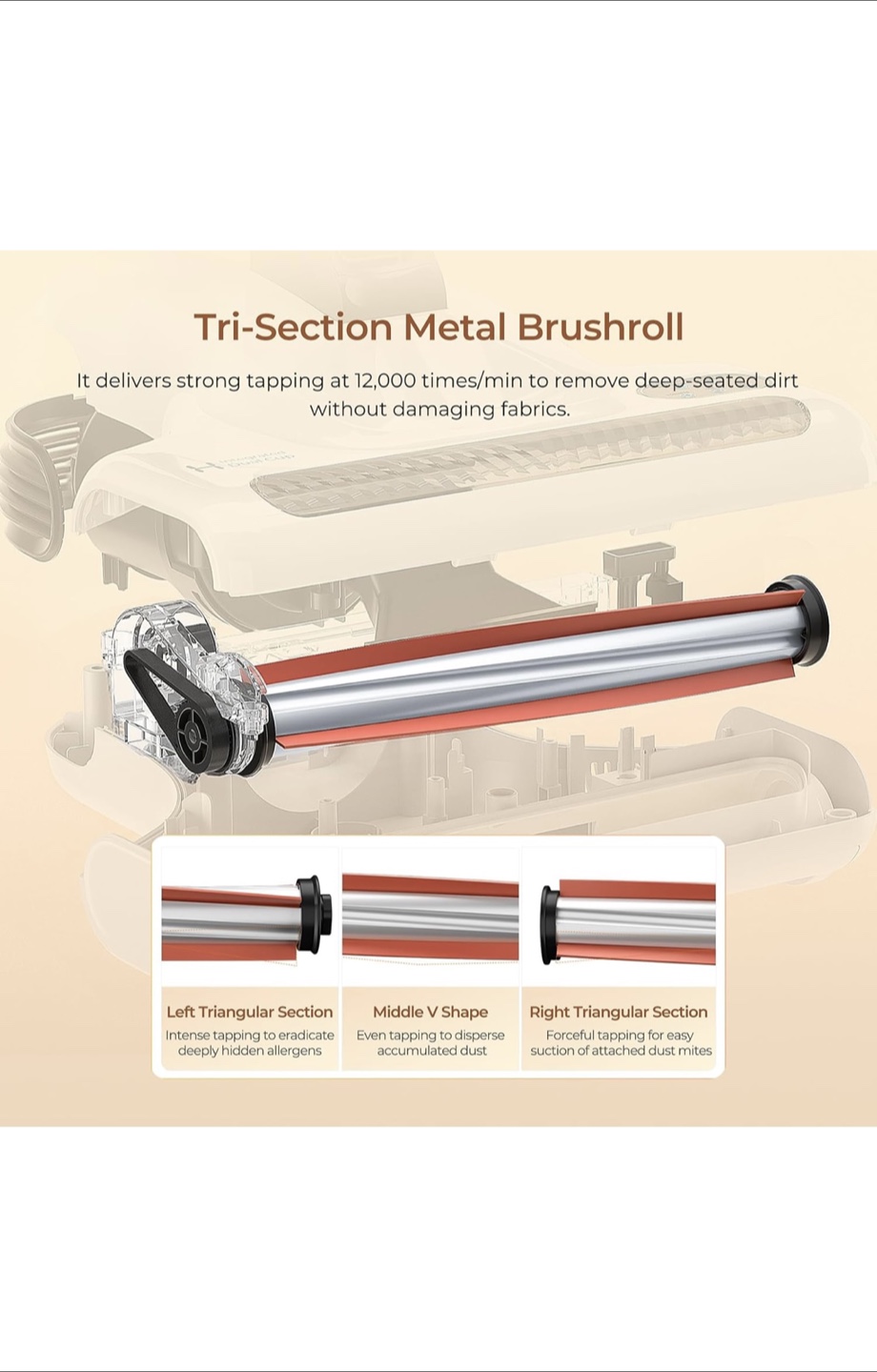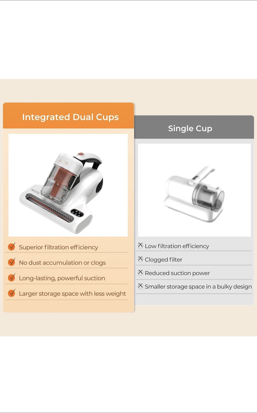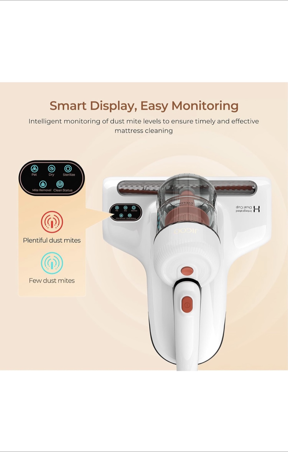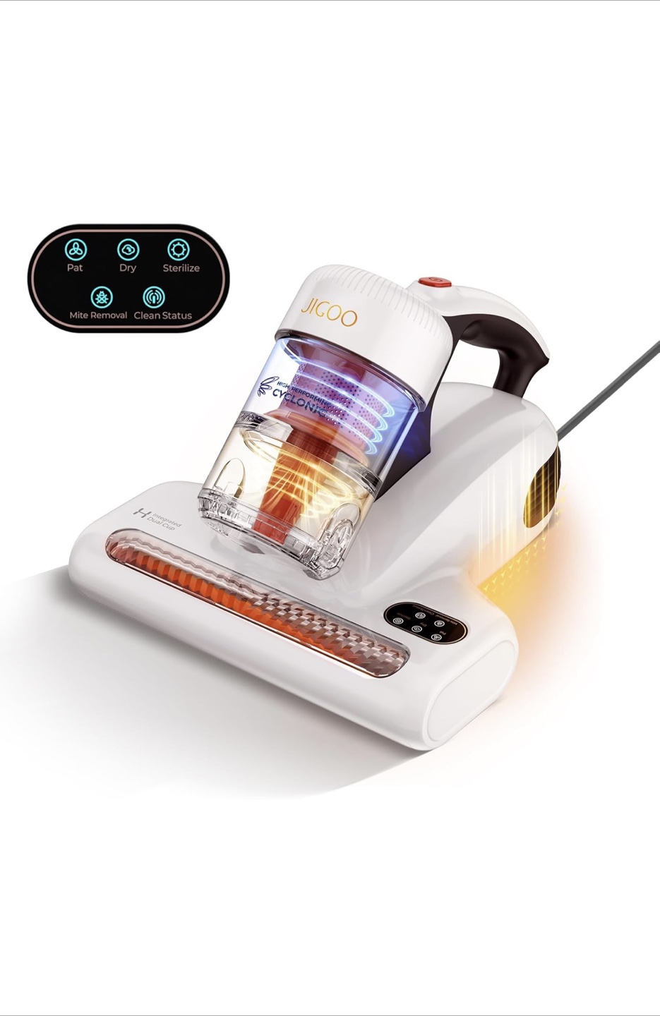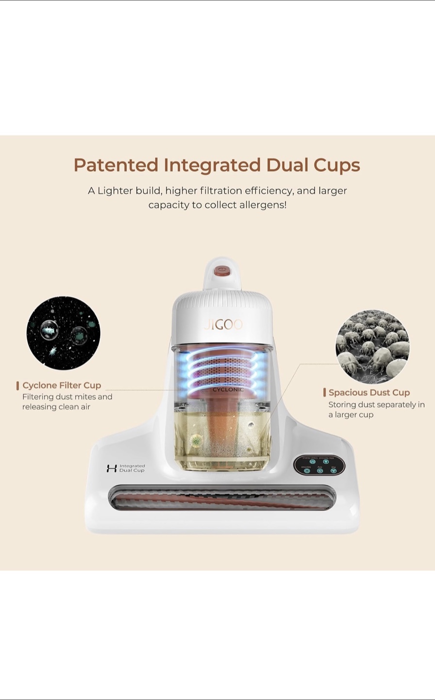 Lightweight cordless vacuum cleaner. Features dual dust cups and UV lamp for mite removal. Includes multiple settings for various cleaning tasks. Patented integrated dual cup system. Smart display for easy monitoring.
