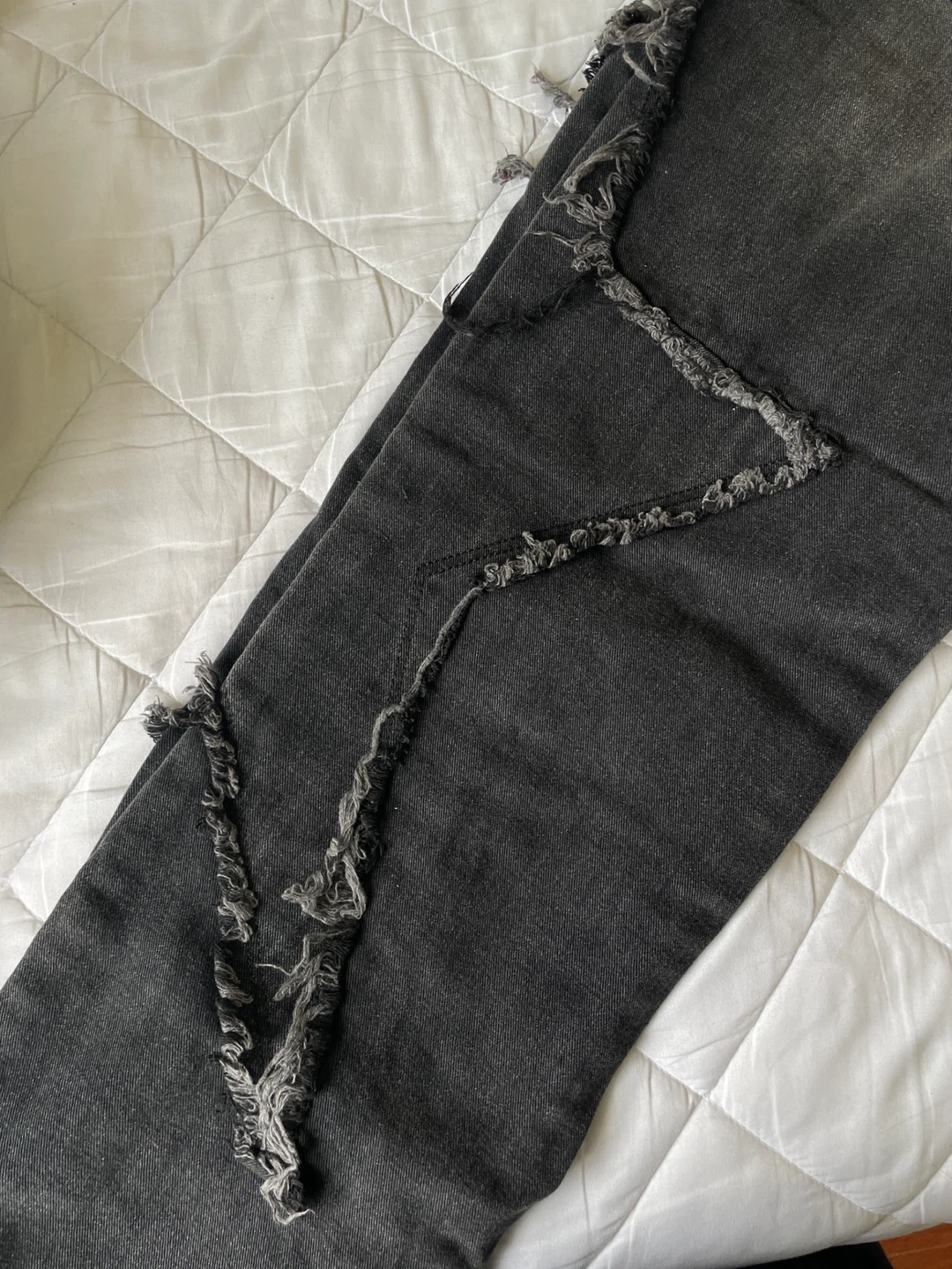 These black denim jeans feature a distressed design with unique frayed detailing along the legs. They have a classic five-pocket style with a zip fly and button closure. Looks like they're ready for a new wardrobe!