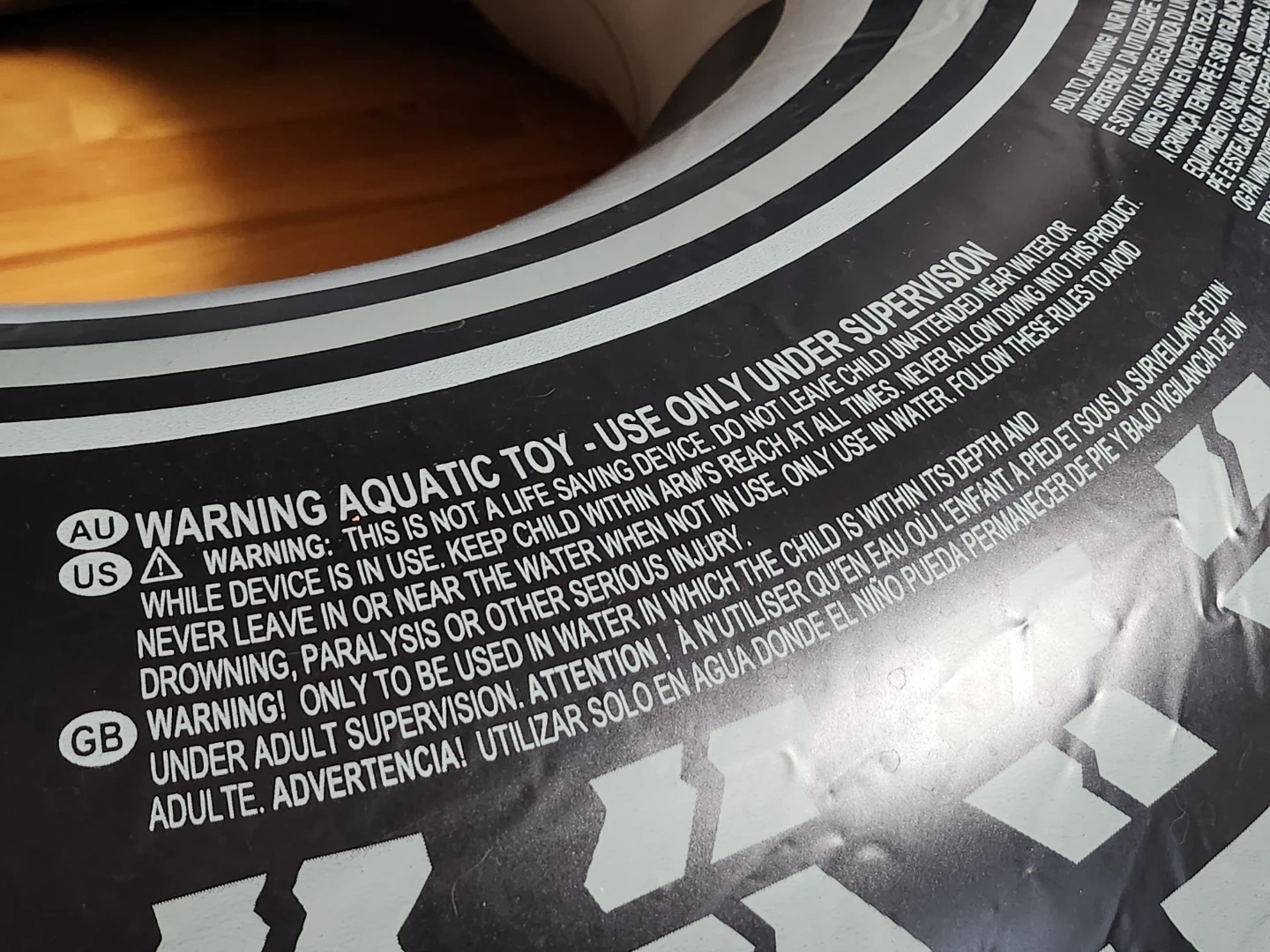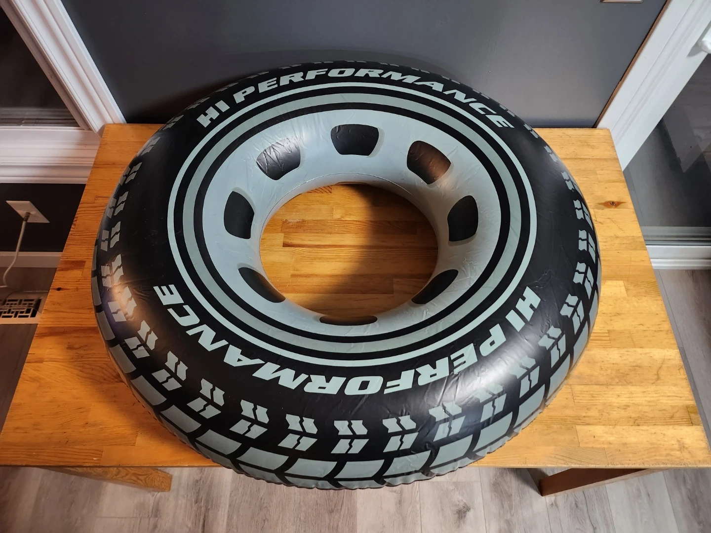 Intex Monster Truck Tube pool float. The inflatable tube is designed to look like a large tire, complete with a realistic "radial" tread and sidewall design that reads "HI PERFORMANCE".