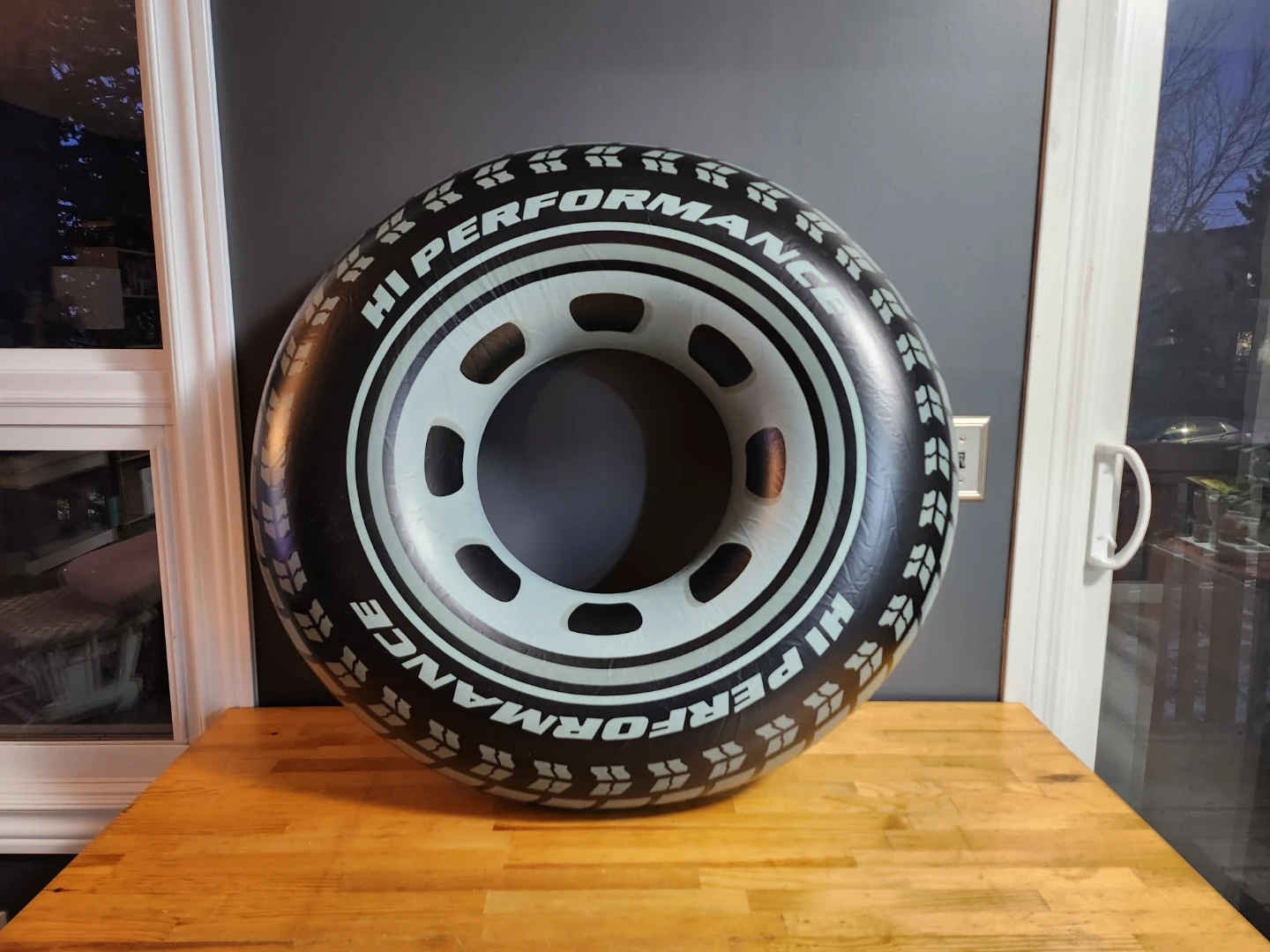 Intex Monster Truck Tube pool float. The inflatable tube is designed to look like a large tire, complete with a realistic "radial" tread and sidewall design that reads "HI PERFORMANCE".