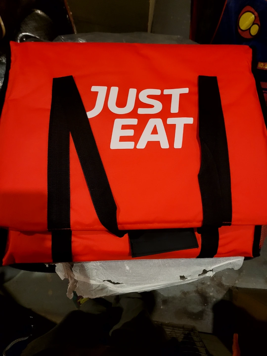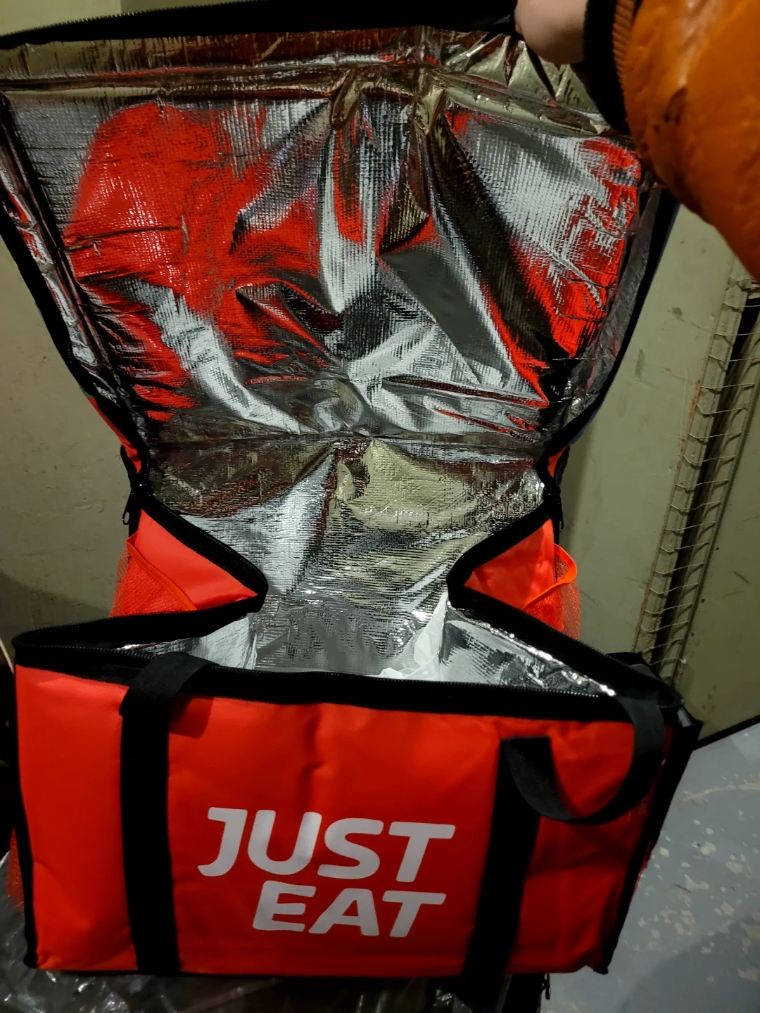 This Just Eat insulated delivery bag is great for keeping food warm. It's bright red with a colourful, patterned lid. The interior lining is silver and reflective.