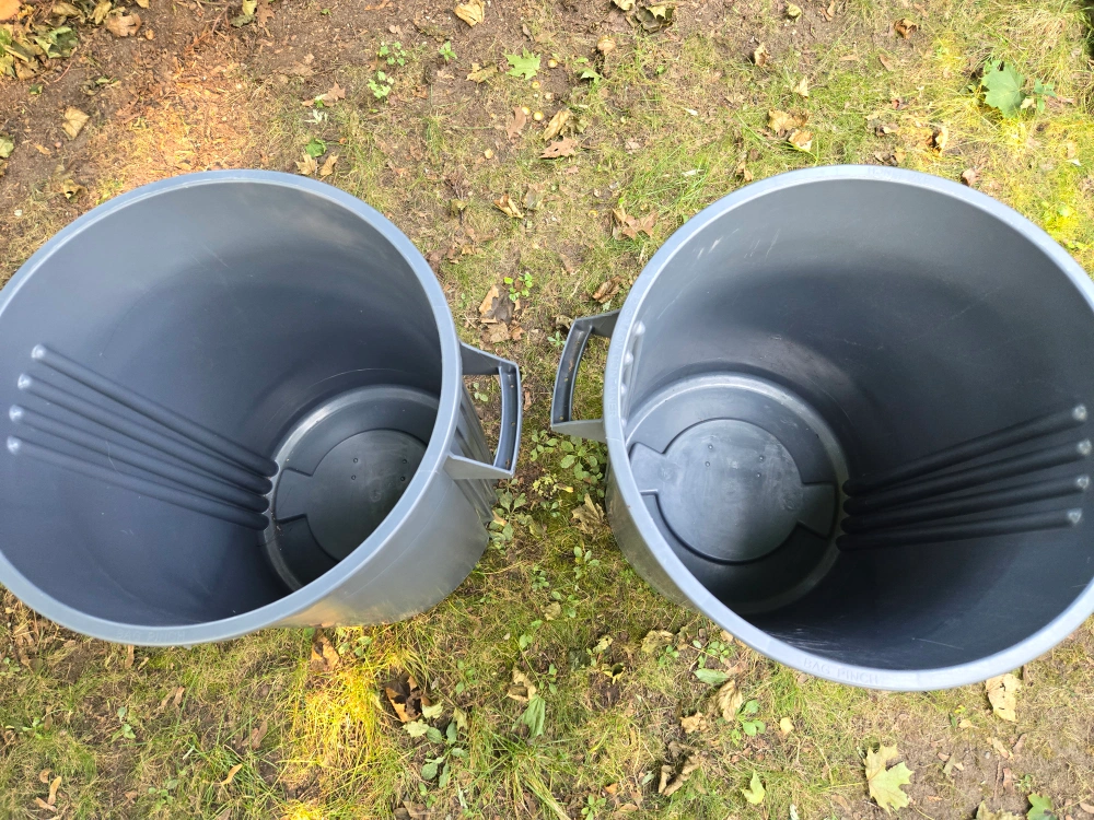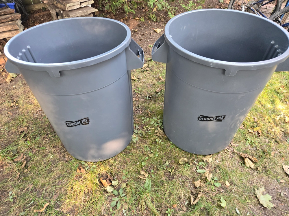 Two grey plastic garbage cans. The cans have a black Genuine Joe logo on the front. The cans have two handles on the side for easy carrying. The top of the cans have a lip for a garbage bag. 44 gallons each. price per bin, commercial quality