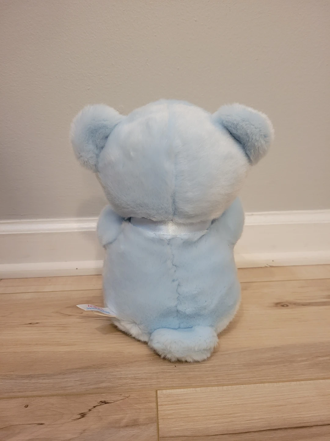 This adorable baby blue teddy bear is super soft and cuddly! It's in great condition and ready for a new home. The brand is Aurora Baby. It features a cute satin bow and 'Baby Boy' embroidered on its feet!