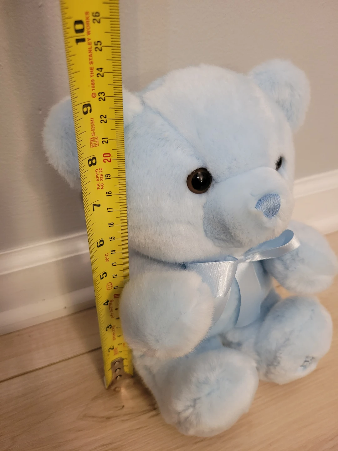 This adorable baby blue teddy bear is super soft and cuddly! It's in great condition and ready for a new home. The brand is Aurora Baby. It features a cute satin bow and 'Baby Boy' embroidered on its feet!