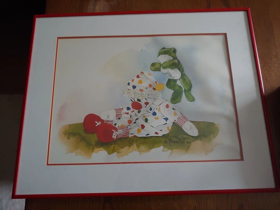 This is a framed watercolor painting depicting a clown and a frog. The painting is signed by the artist "Tosoff '85". The frame is red. Size is 16x20