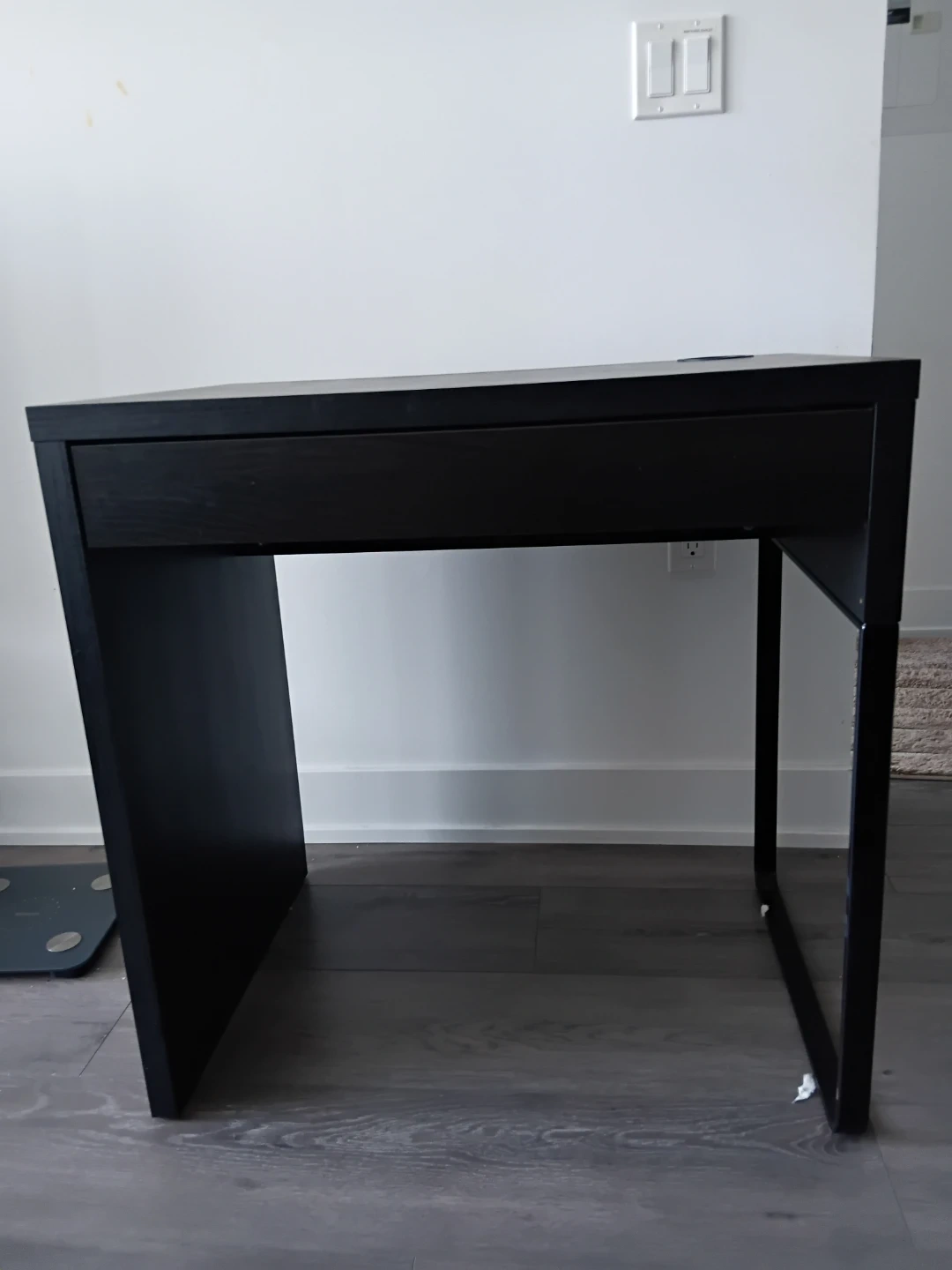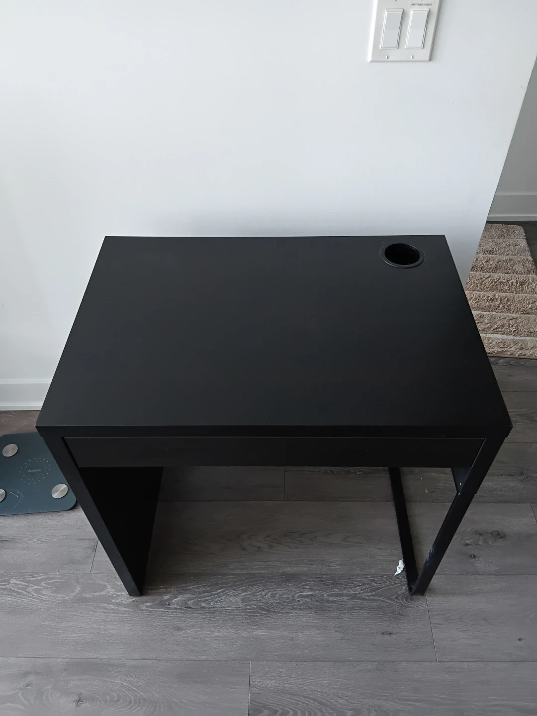 Black desk featuring a single drawer for storage. It has a convenient cable management hole on the tabletop. This desk is perfect for a smaller workspace.