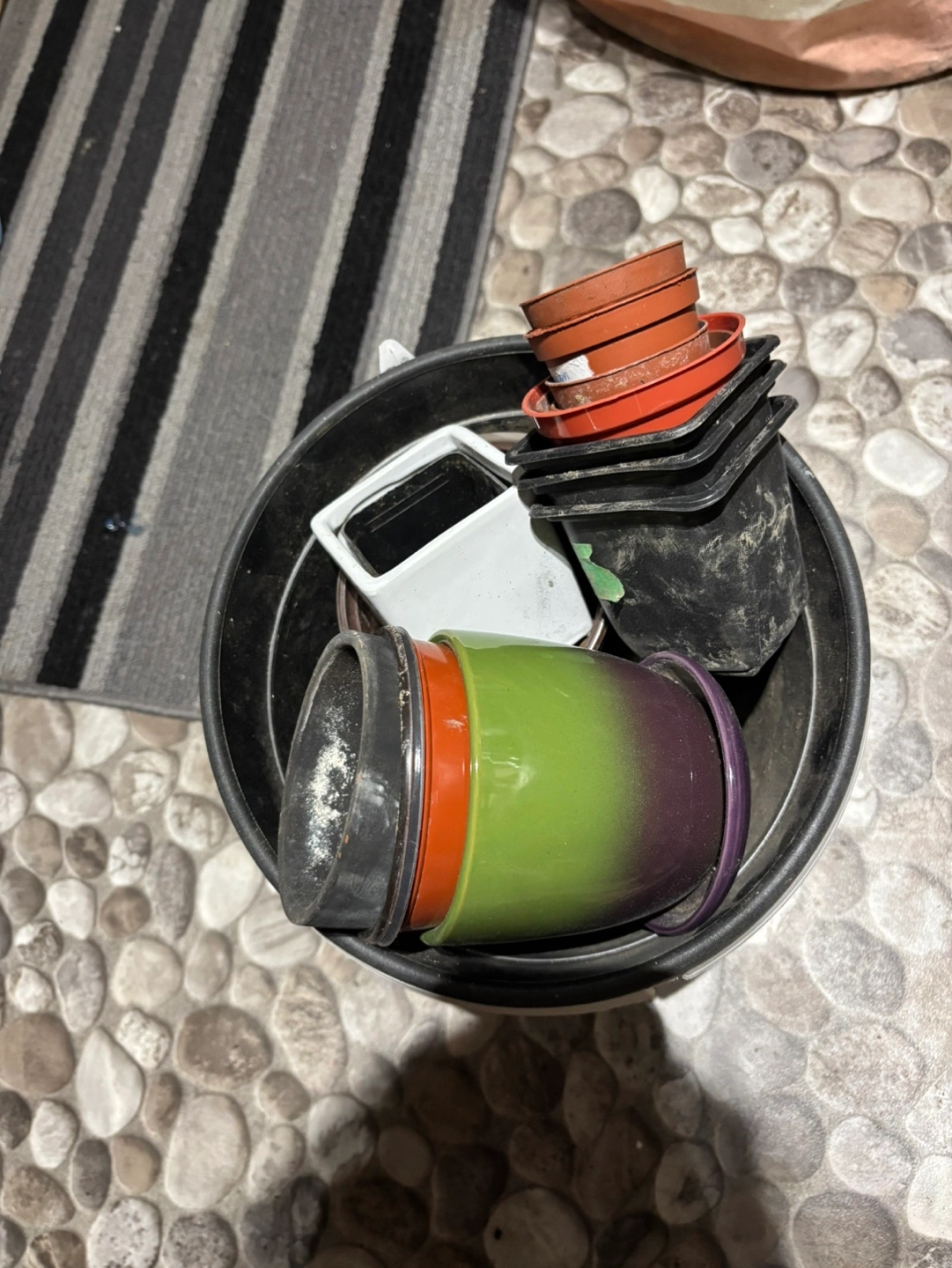 Collection of various sized plastic & ceramic plant pots.