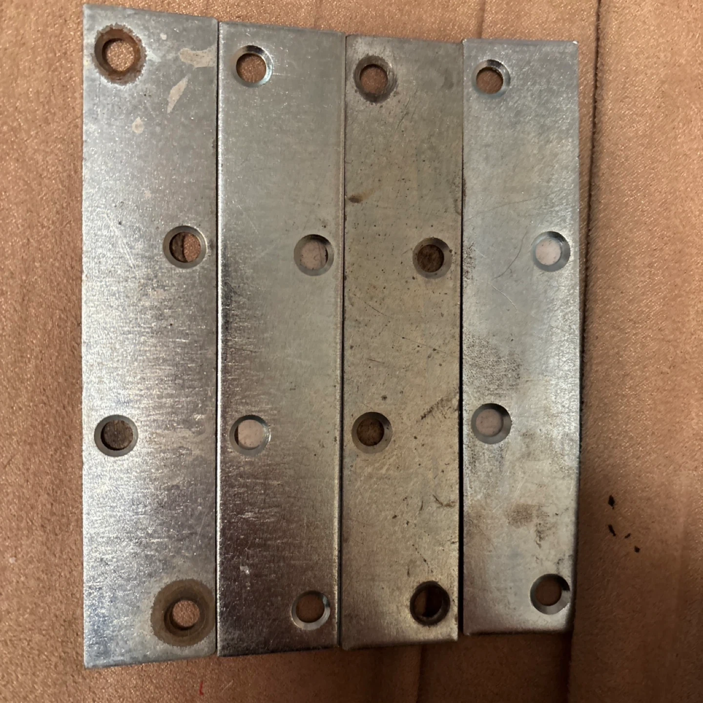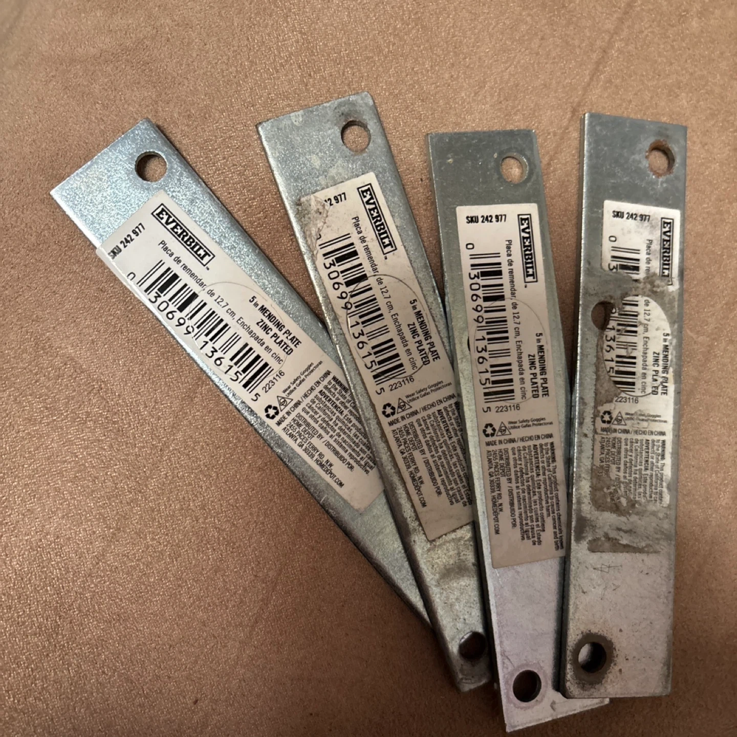 These Everbilt mending plates are 5 inches long and made of zinc. They're useful for repairing or reinforcing wood joints. Each plate is new and has pre-drilled holes for easy mounting. Set of 4.