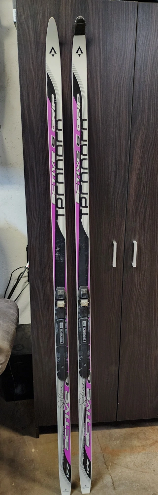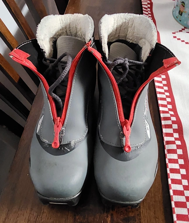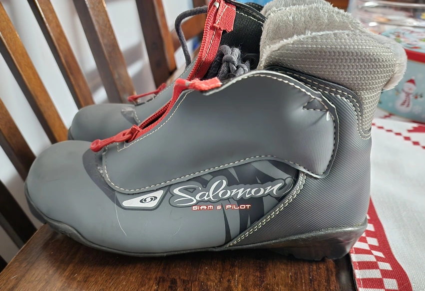 Used Salomon Sirio S Pilot cross-country ski boots. Size 6. Grey and red. Zipper closures. Good condition, minor wear.