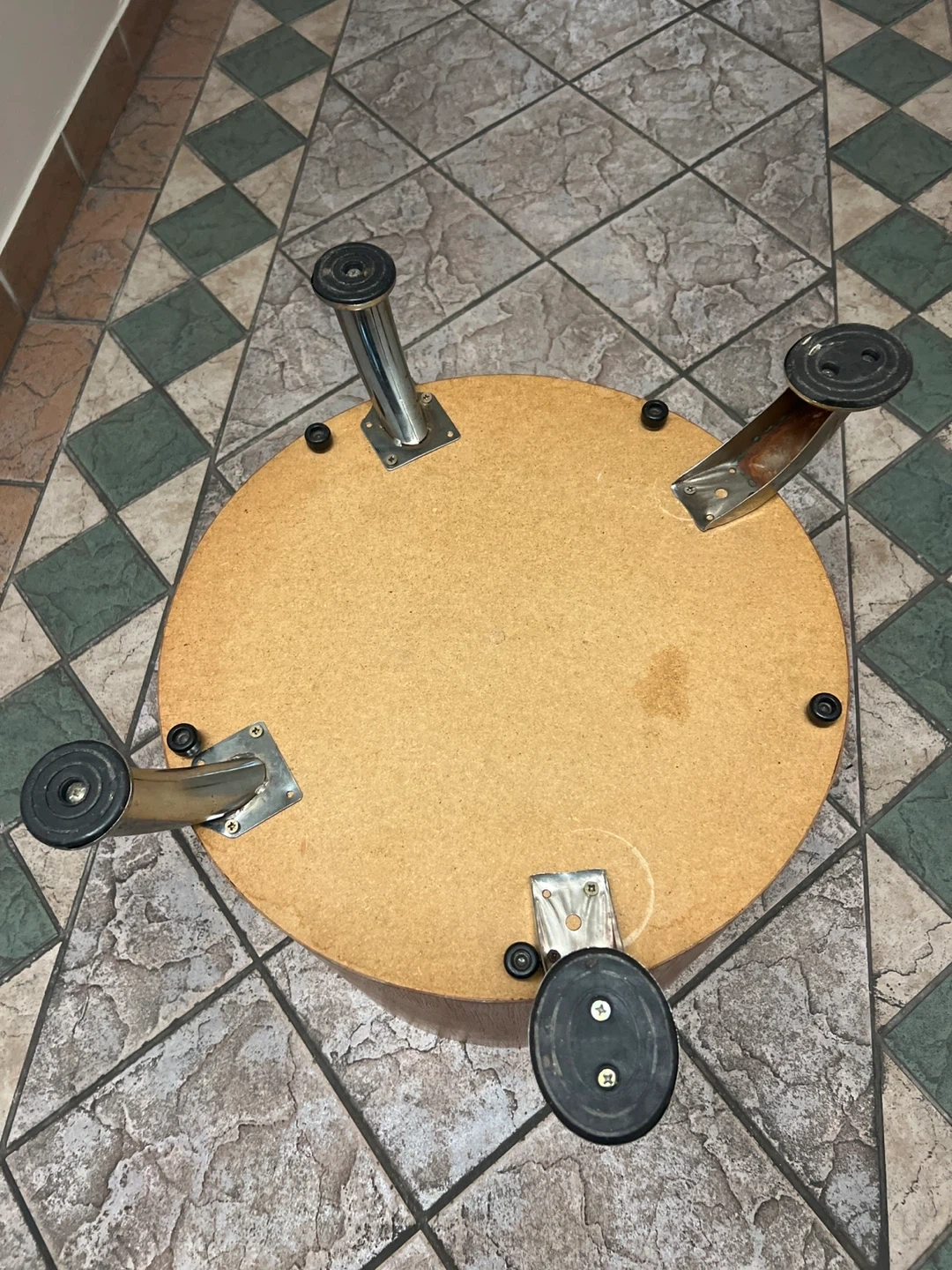 This is a round side table with a light wood finish and chrome legs. It's a good size for placing next to a couch or chair. The table is sturdy and has a clean, simple design.