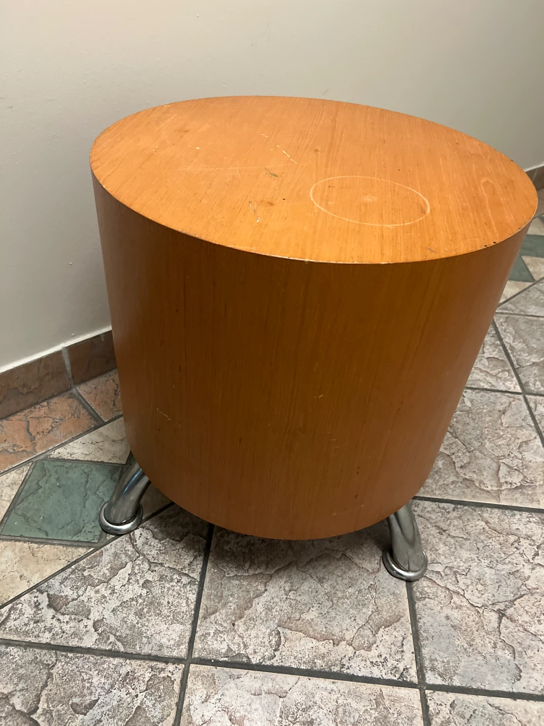 This is a round side table with a light wood finish and chrome legs. It's a good size for placing next to a couch or chair. The table is sturdy and has a clean, simple design.