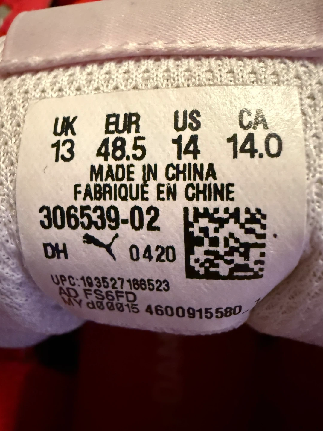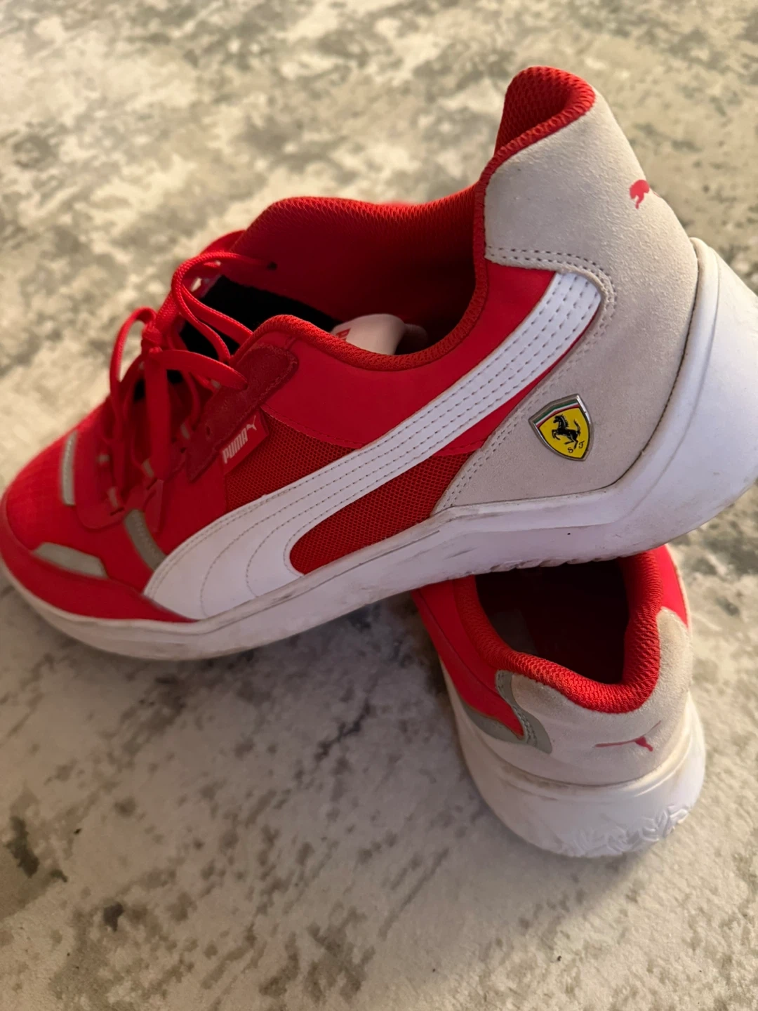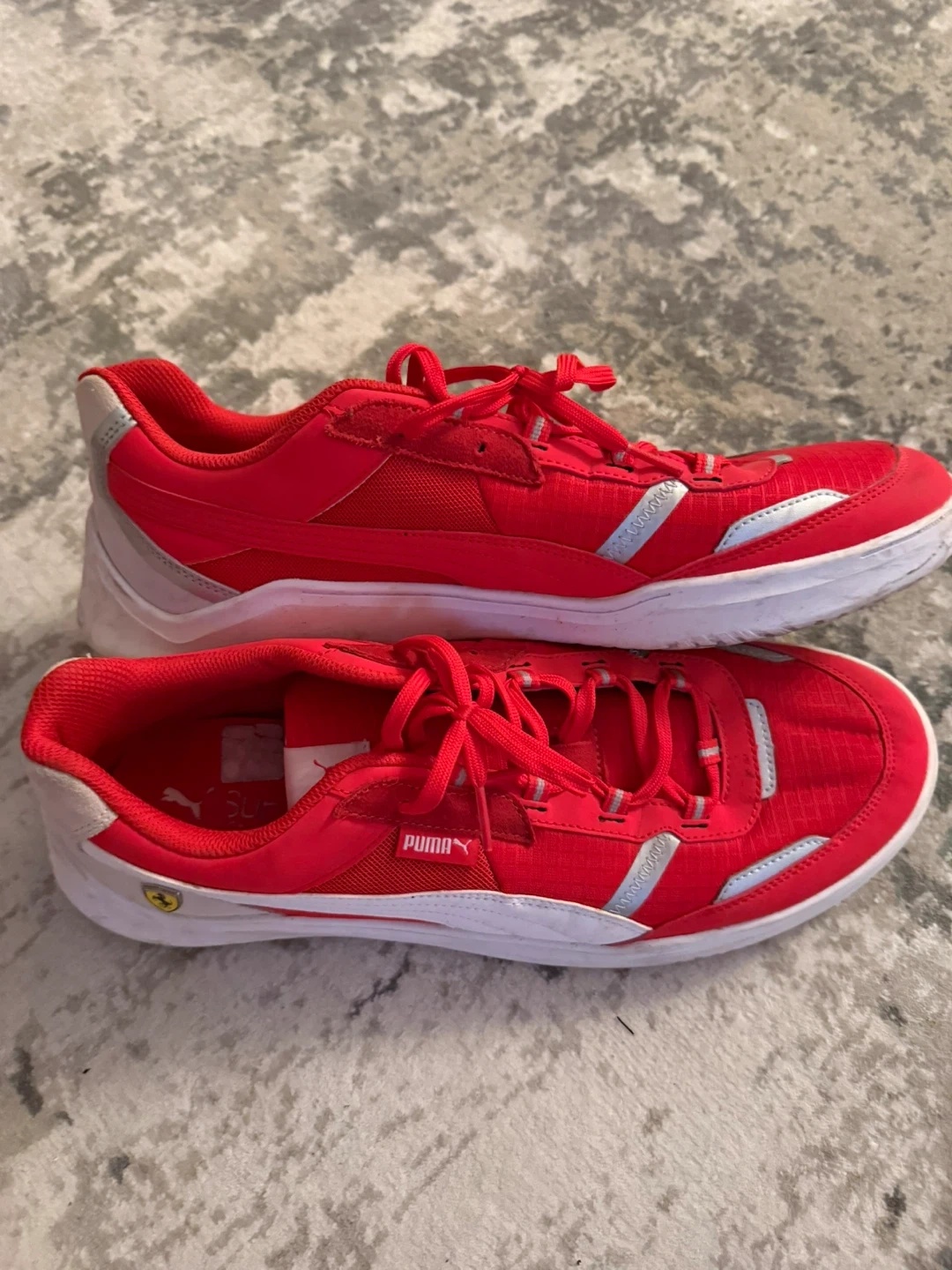 Red and white Puma Scuderia Ferrari Kart Cat III shoes. Size 14 US men's. Designed for comfort and style.