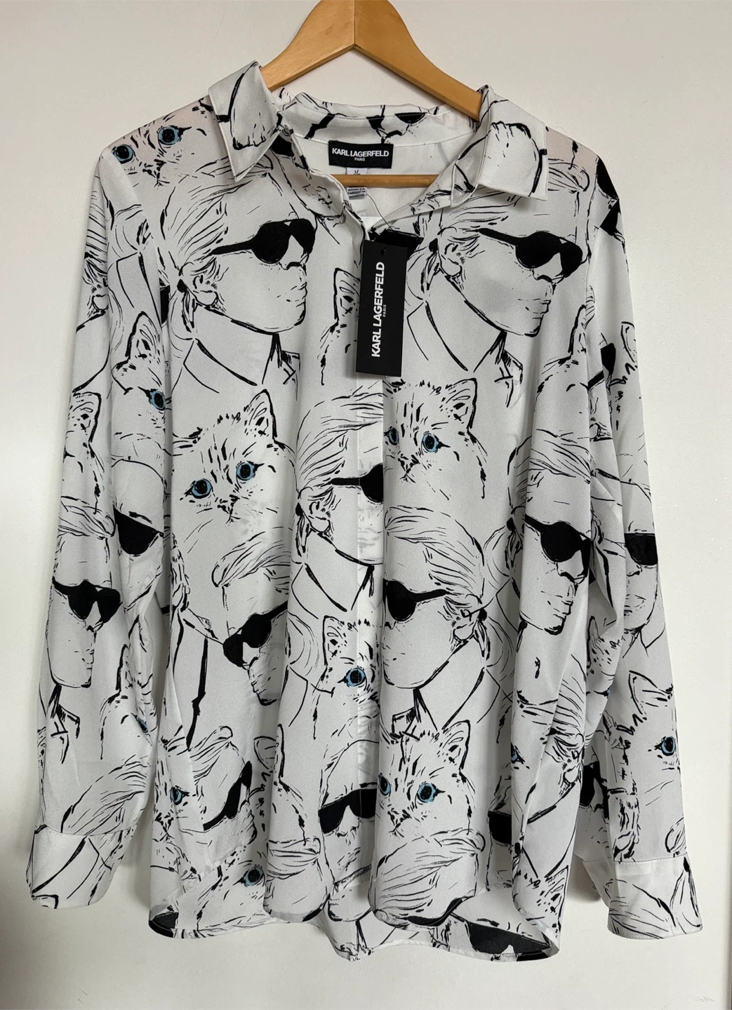 Here's a Karl Lagerfeld button-up shirt in size M! The shirt features a unique white pattern with Karl Lagerfeld's likeness and cats wearing sunglasses.