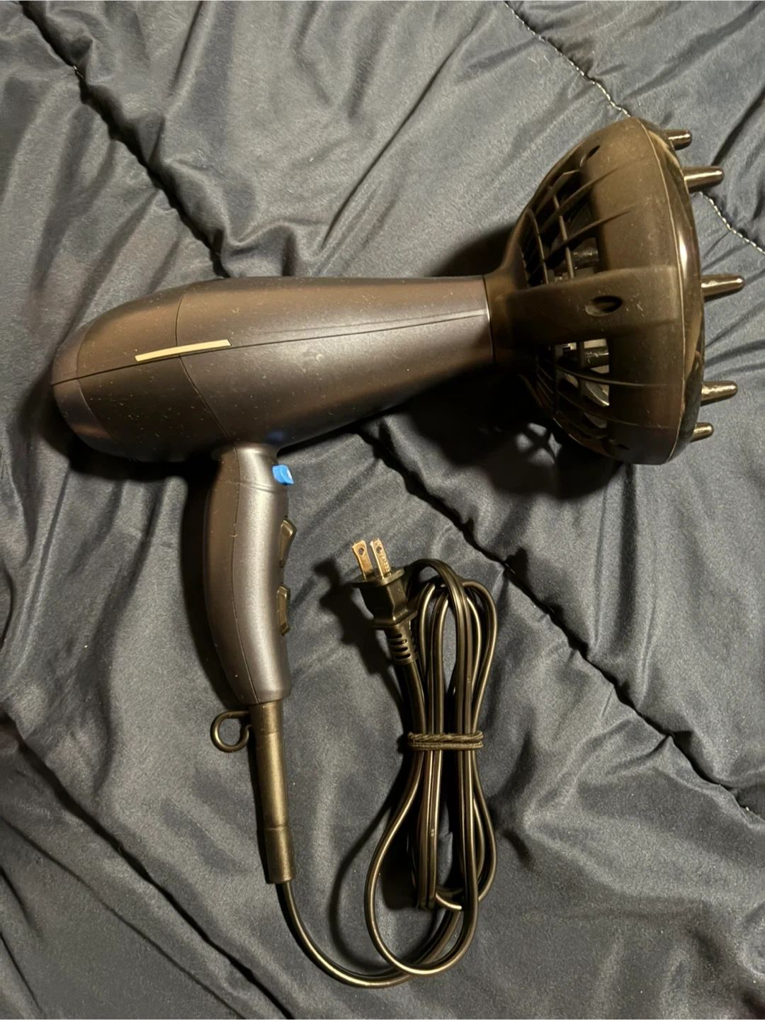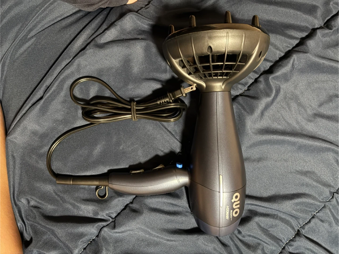 This QUO CONAIR hair dryer comes with a diffuser attachment. It's designed for creating volume and reducing frizz. Great for curly hair types!
