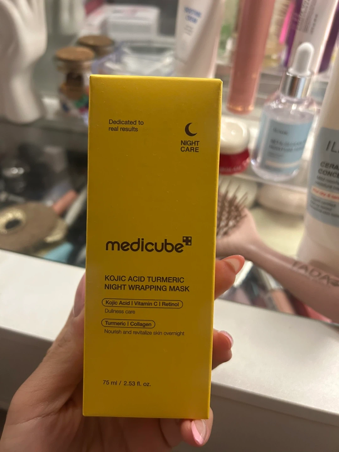 This Medicube Kojic Acid Turmeric Night Wrapping Mask is designed for night care. It contains Kojic Acid, Vitamin C, Retinol, Turmeric, and Collagen to nourish and revitalize skin overnight. The volume is 75 ml or 2.53 fl. oz.!