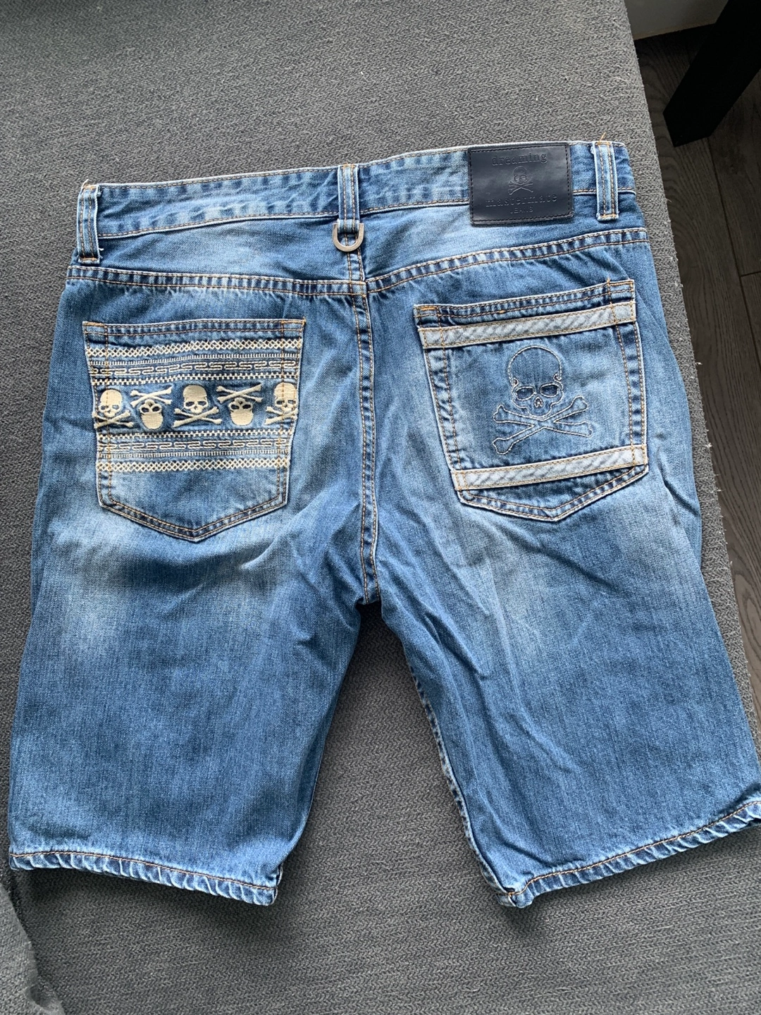 Lightly distressed denim shorts. Embroidered skull details. Classic five-pocket styling. Great summer shorts.