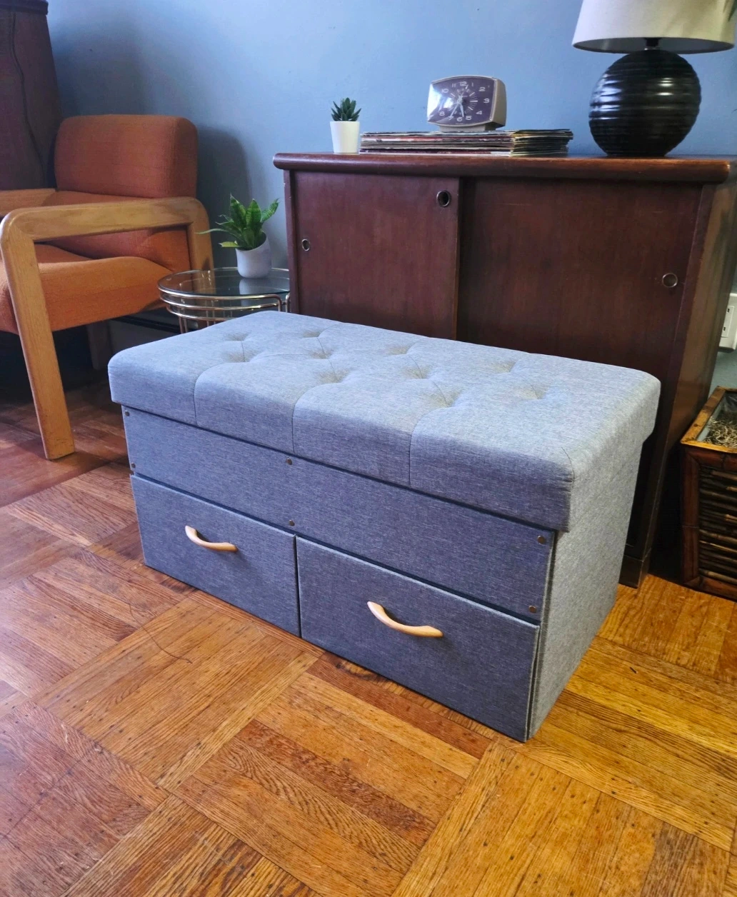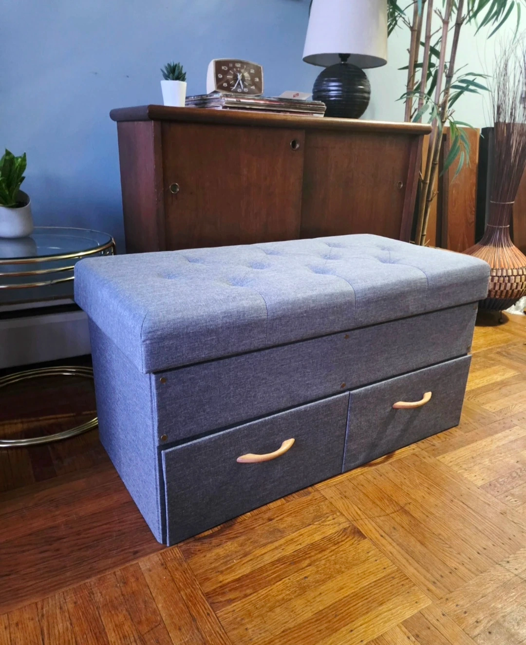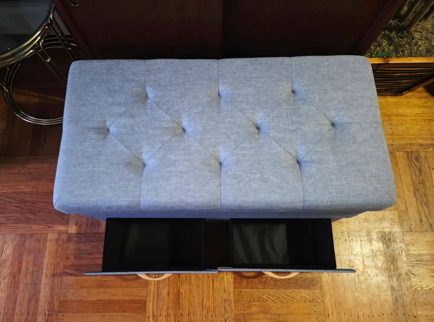Grey tufted fabric storage bench with two drawer in flawless condition.