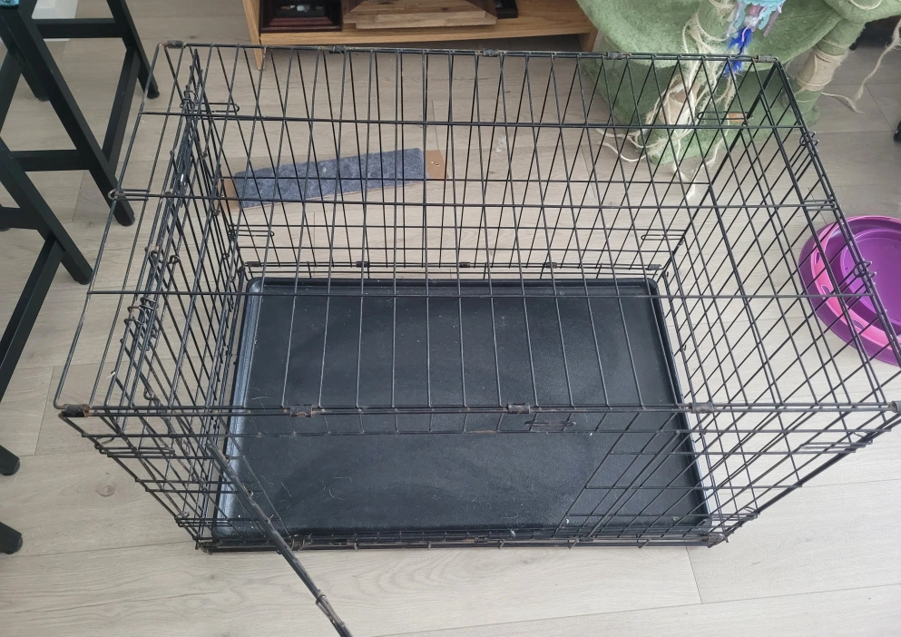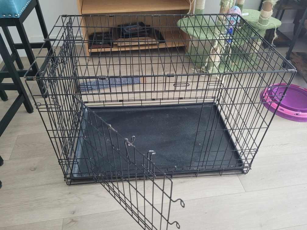 35 x 22 x 25 Selling a used dog crate with double doors in black. It's in good condition and comes with a tray at the bottom for easy cleaning. Great for training or providing a safe space for your furry friend!