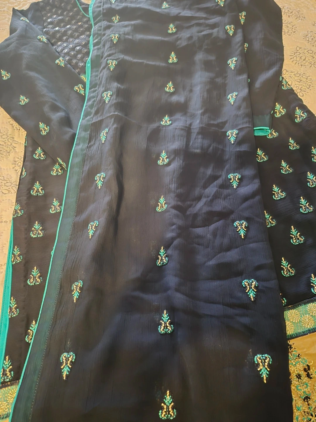 Beautiful black dress with delicate pink embroidery detailing. Includes a matching light pink scarf. Perfect for a special occasion or adding a touch of elegance to your wardrobe