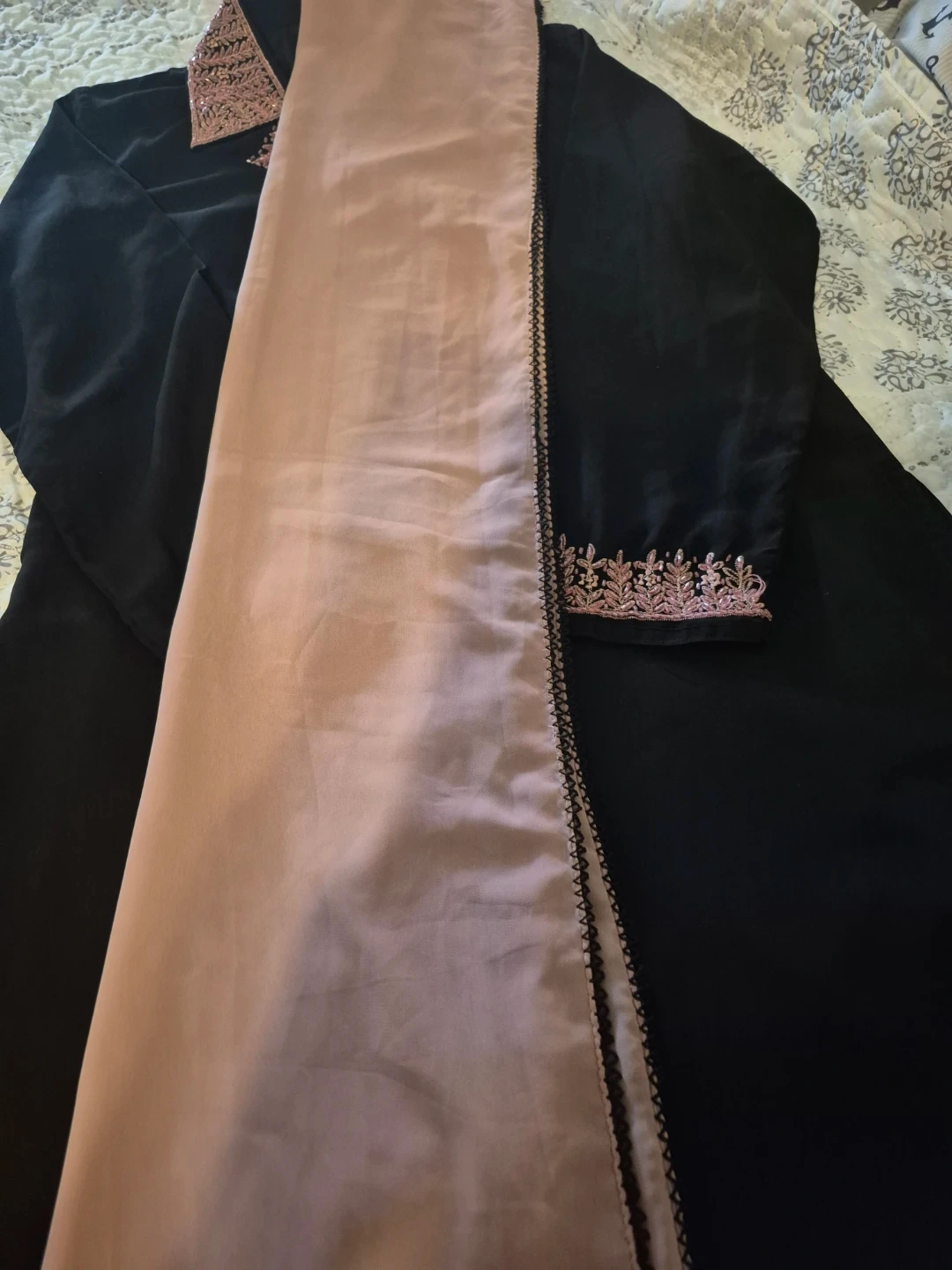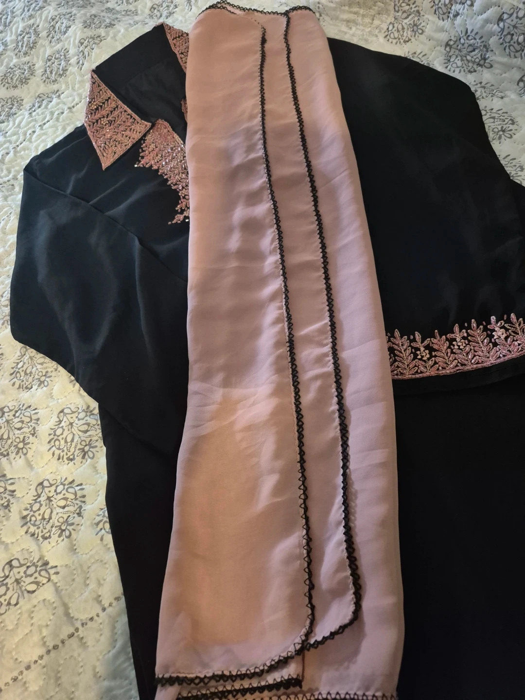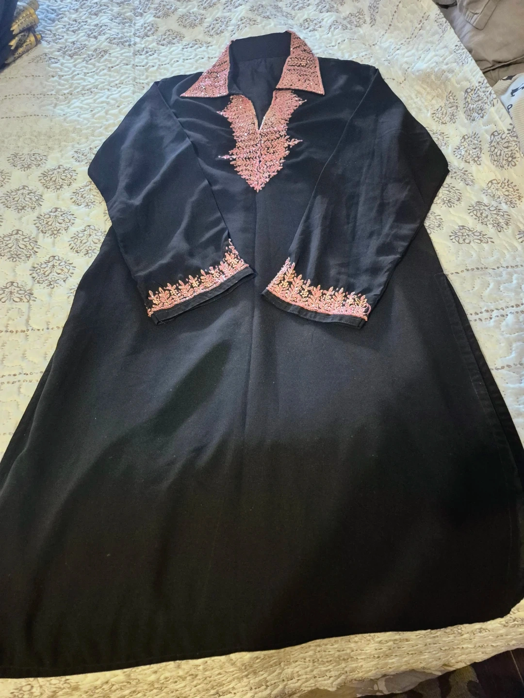 Beautiful black dress with delicate pink embroidery detailing. Includes a matching light pink scarf. Perfect for a special occasion or adding a touch of elegance to your wardrobe