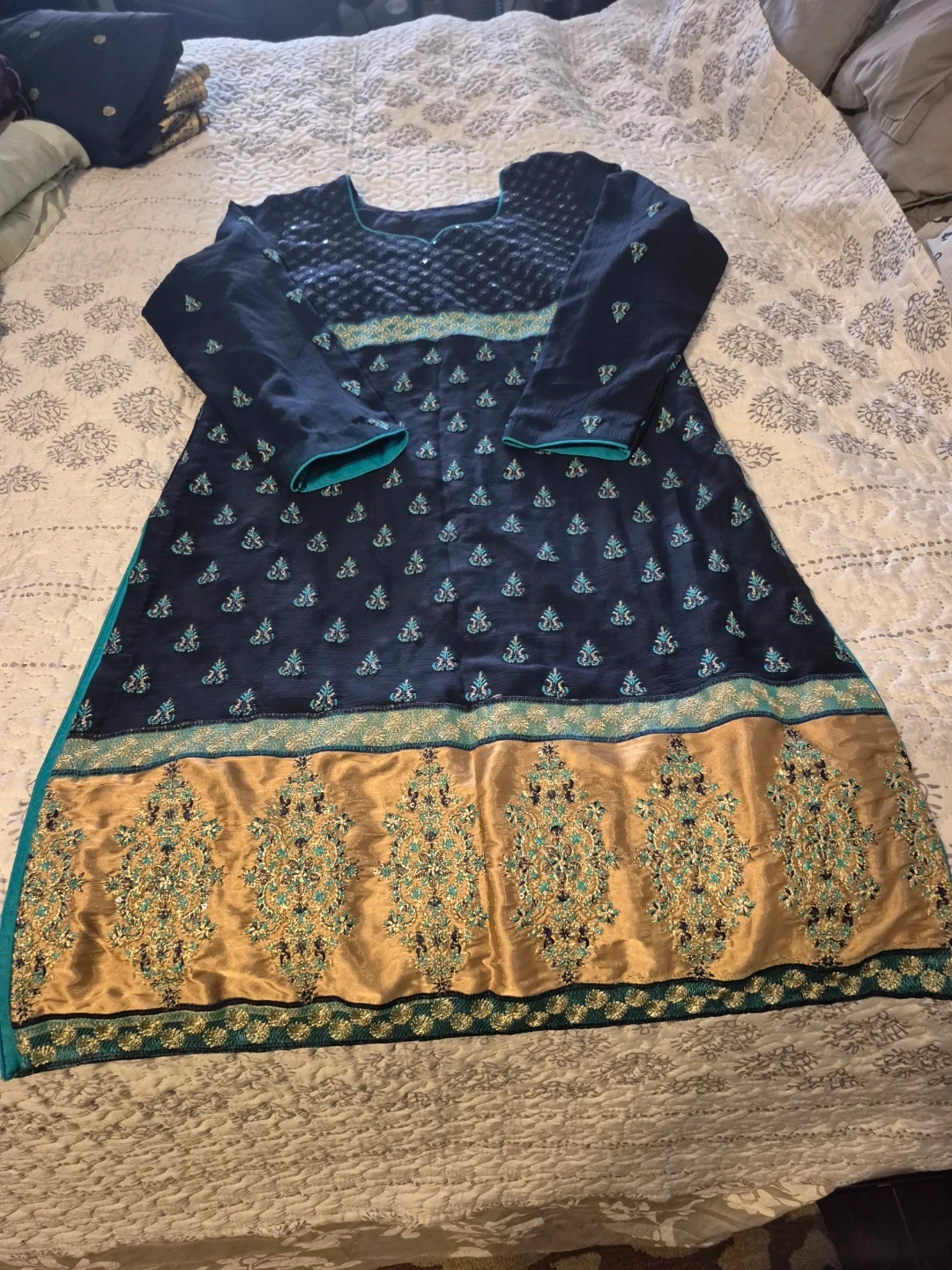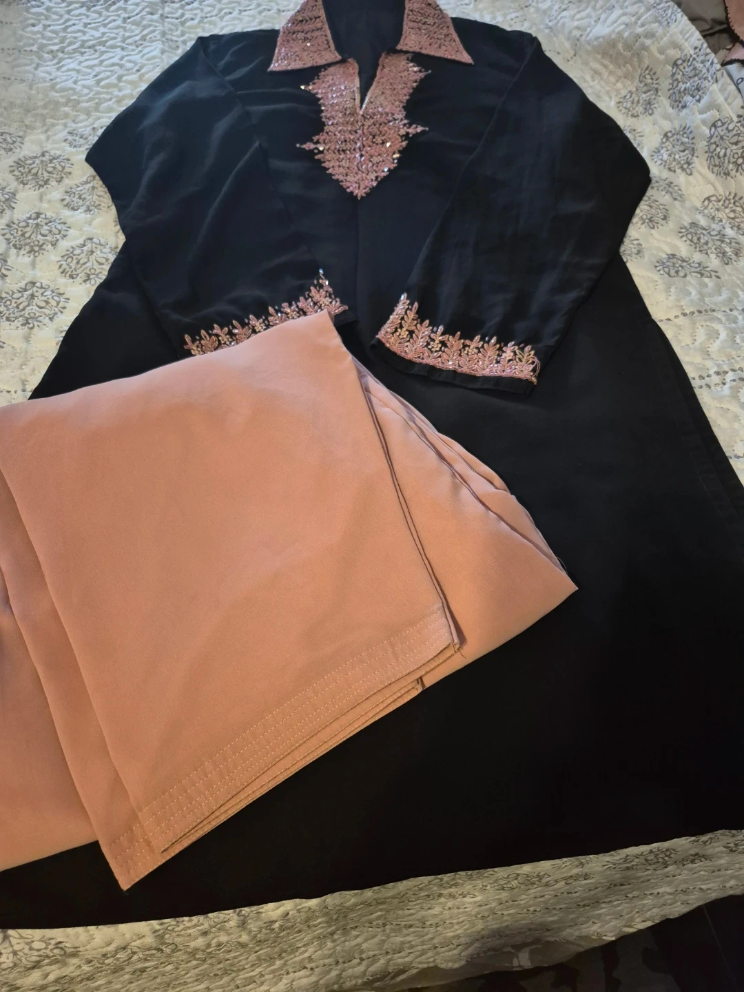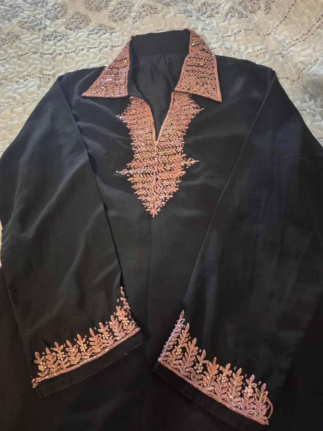Beautiful black dress with delicate pink embroidery detailing. Includes a matching light pink scarf. Perfect for a special occasion or adding a touch of elegance to your wardrobe