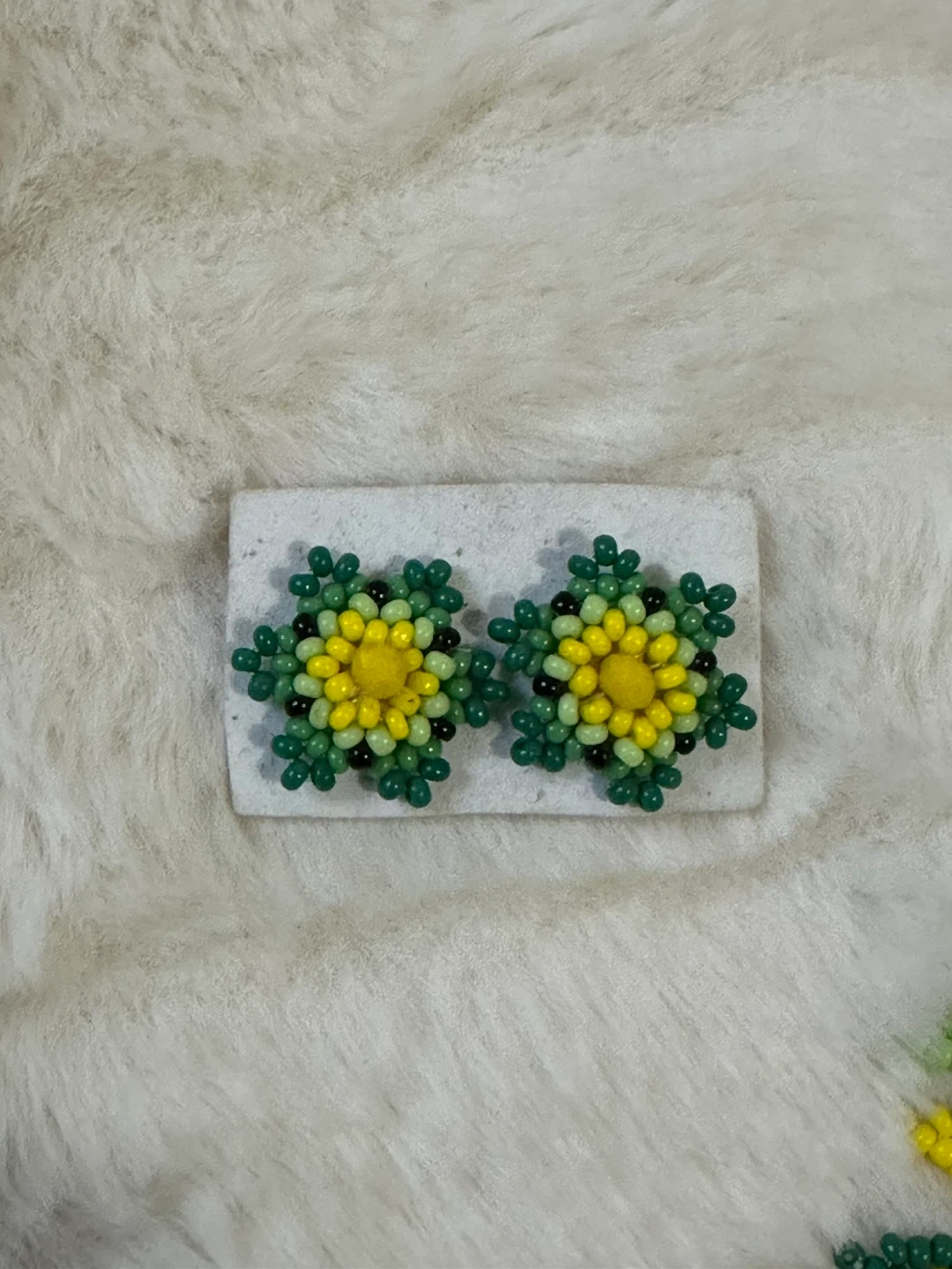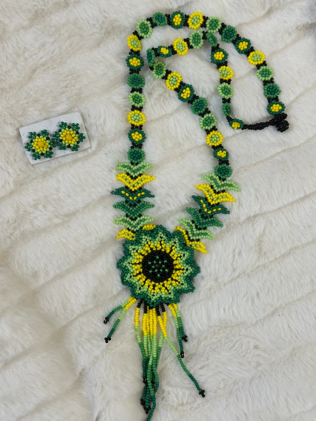 Beautiful handcrafted necklace and matching earrings made with small green and yellow glass beads (chaquira), inspired by traditional Mexican Huichol art.