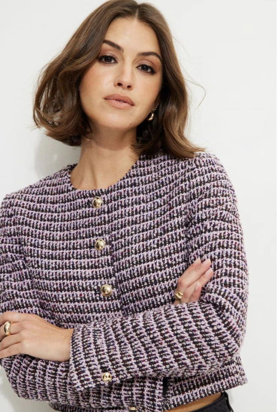 This is a cute tweed jacket and skirt. It's perfect for adding a touch of sophistication to any outfit. The jacket features a stylish tweed pattern with gold button accents. The Jacket is $30 and the skirt is $20
