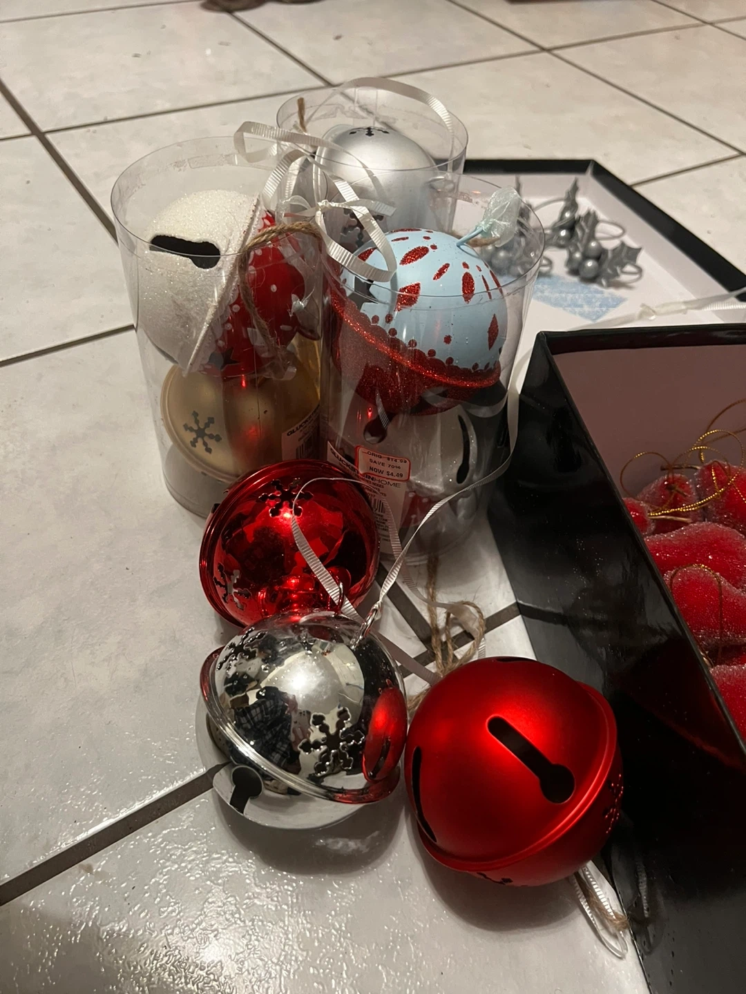 I have a collection of Christmas ornaments for sale! There's a variety of styles and colours to choose from, including red, silver, white, and blue. They're in great condition and ready to decorate your tree this holiday season