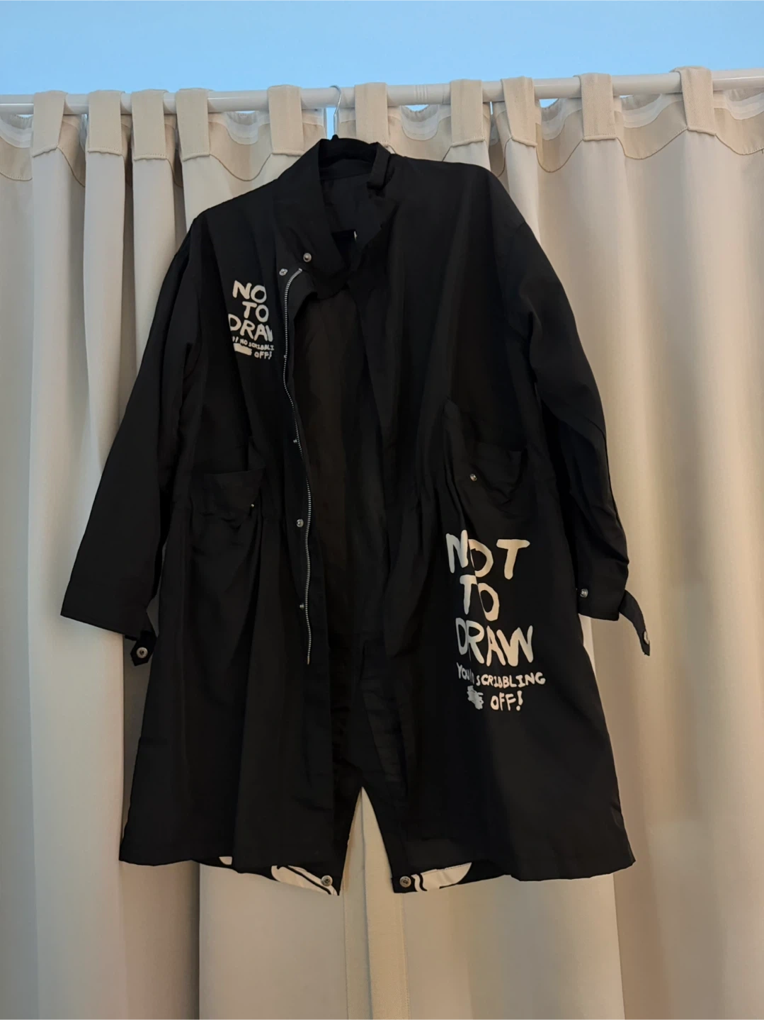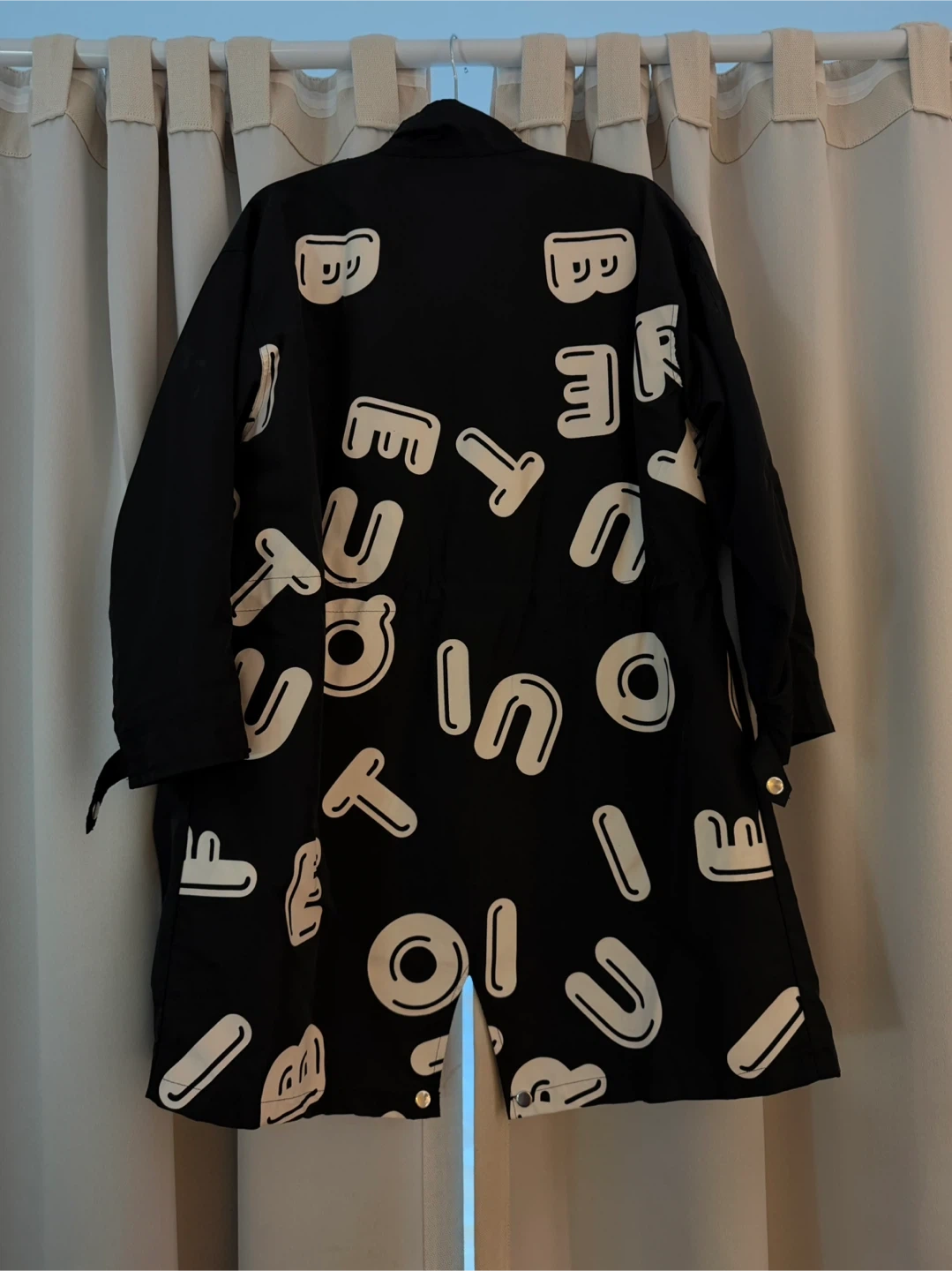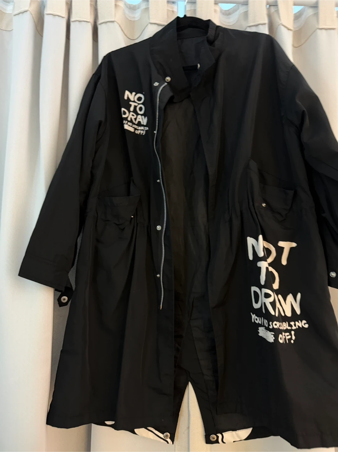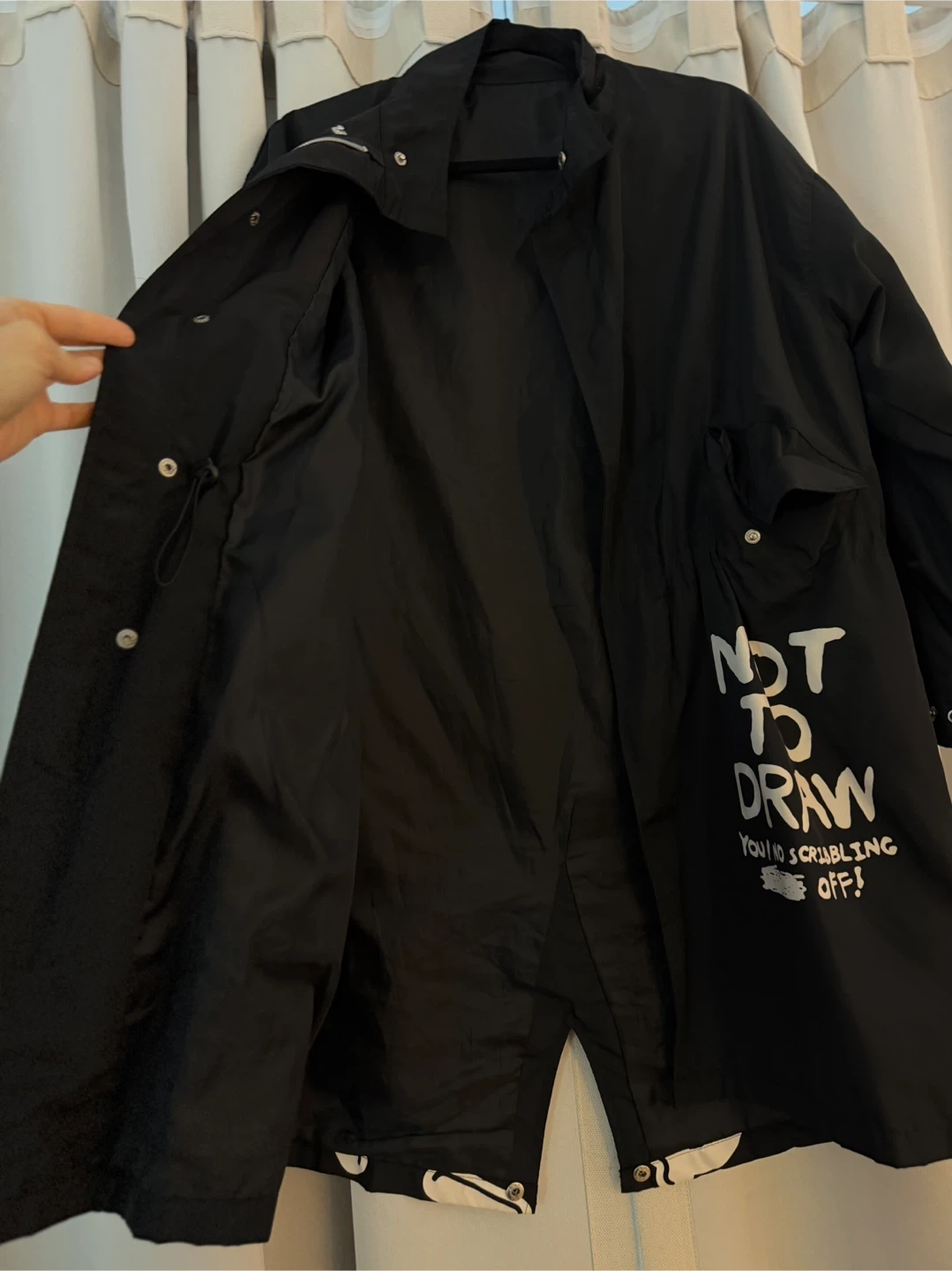 Selling a black jacket that's made of 100% polyester. It has a cool design with white graphics on the front and back.