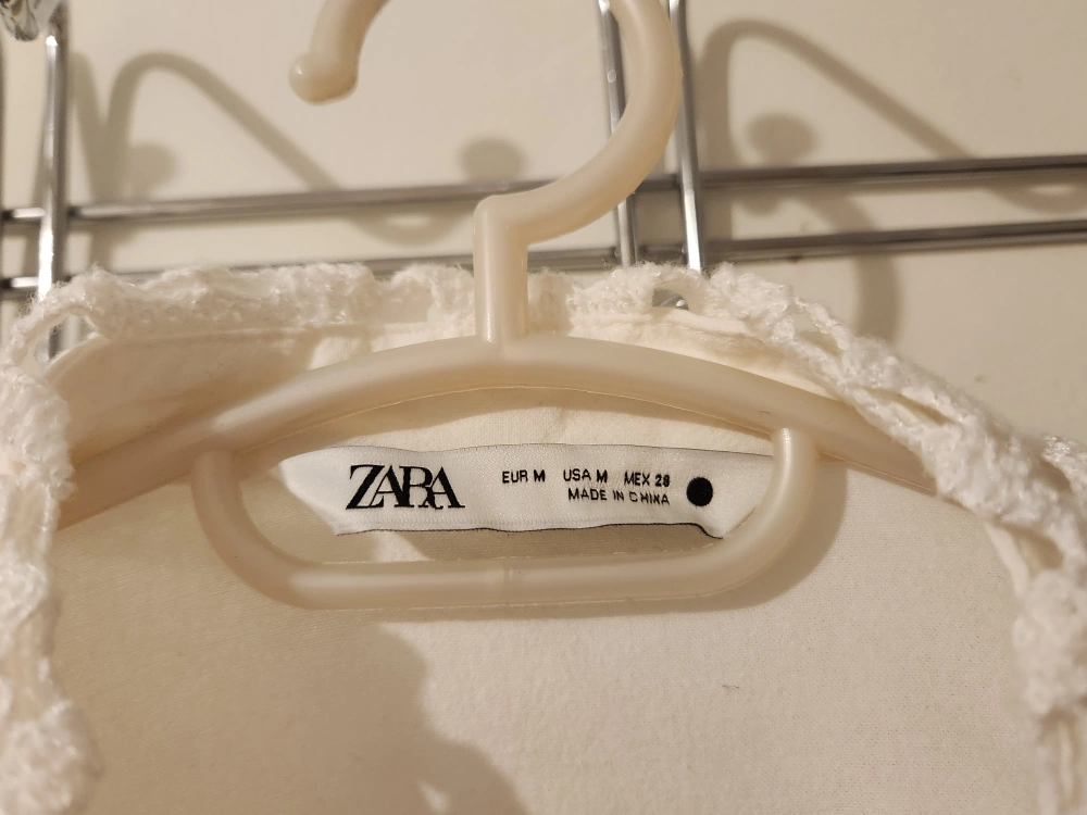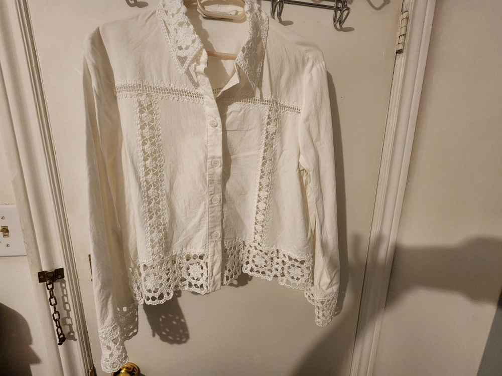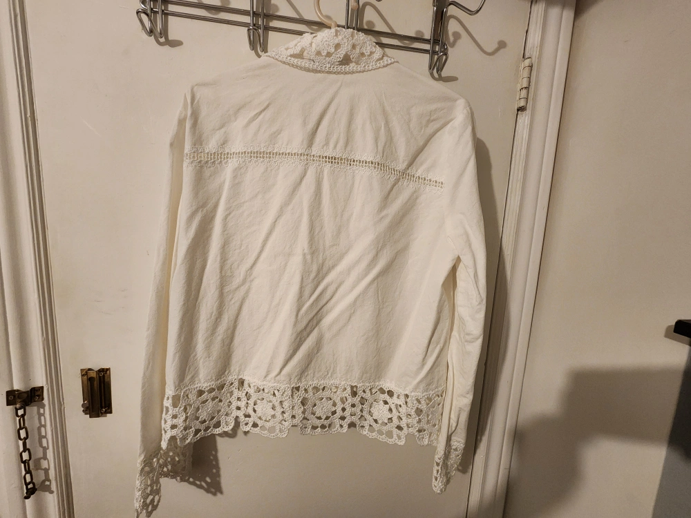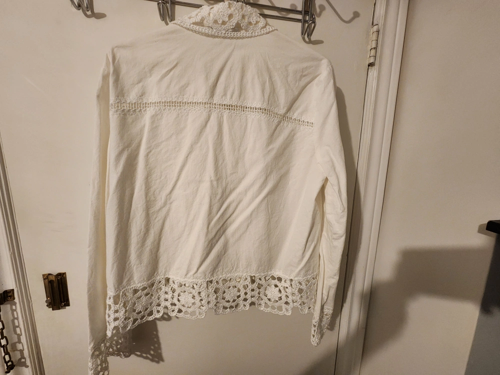 Long-sleeved white blouse with crochet detailing on the collar, cuffs, and hem. The blouse features a button-up front closure. It is a size Medium.
