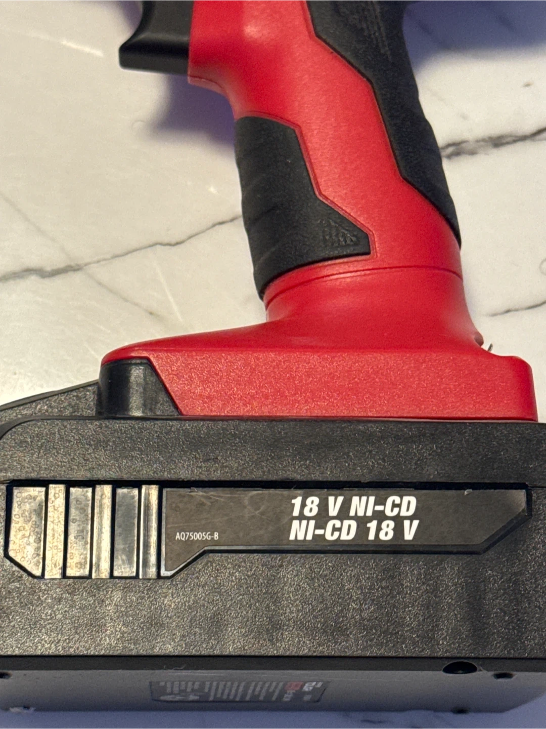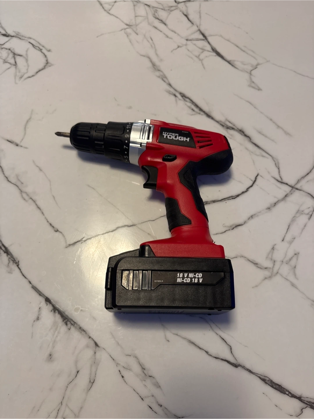 This is a Hyper Tough 18V cordless drill. It's a Ni-CD model. It has a red and black colour scheme. No charger