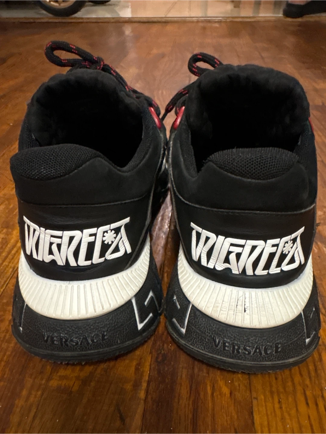Selling a pair of Versace Trigreca sneakers. They feature a unique design with Versace branding and a distinctive sole. These sneakers are in good condition and ready for a new home!