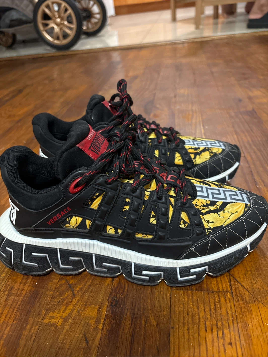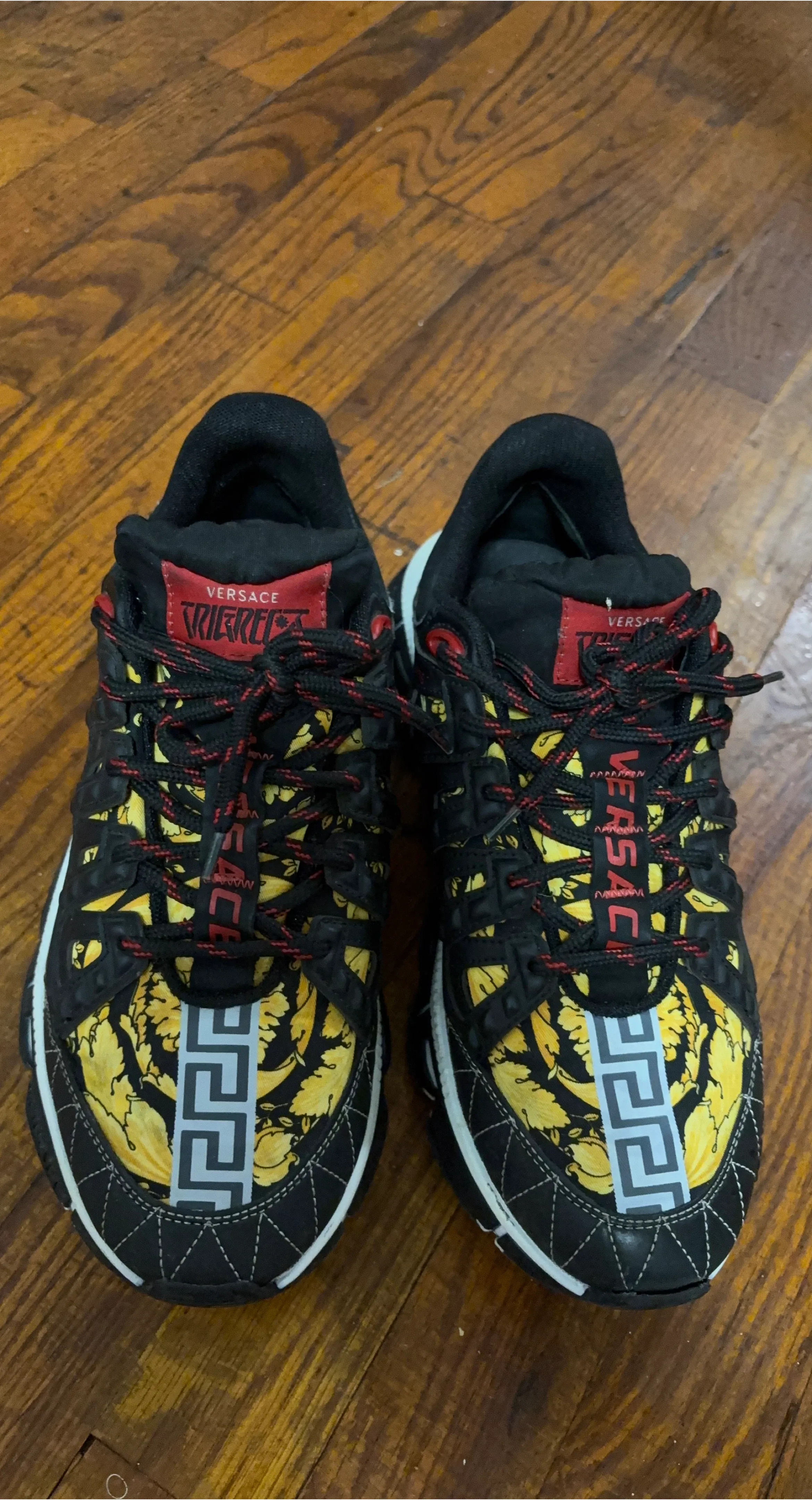Selling a pair of Versace Trigreca sneakers. They feature a unique design with Versace branding and a distinctive sole. These sneakers are in good condition and ready for a new home!