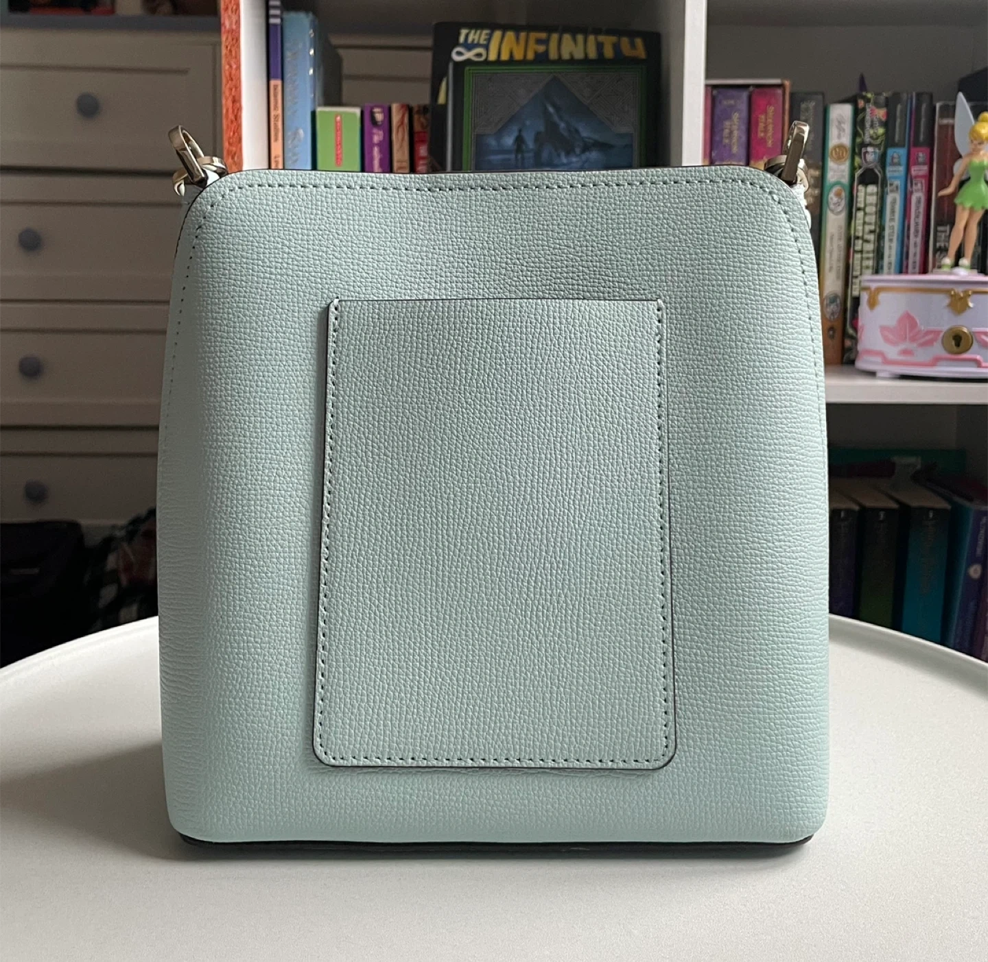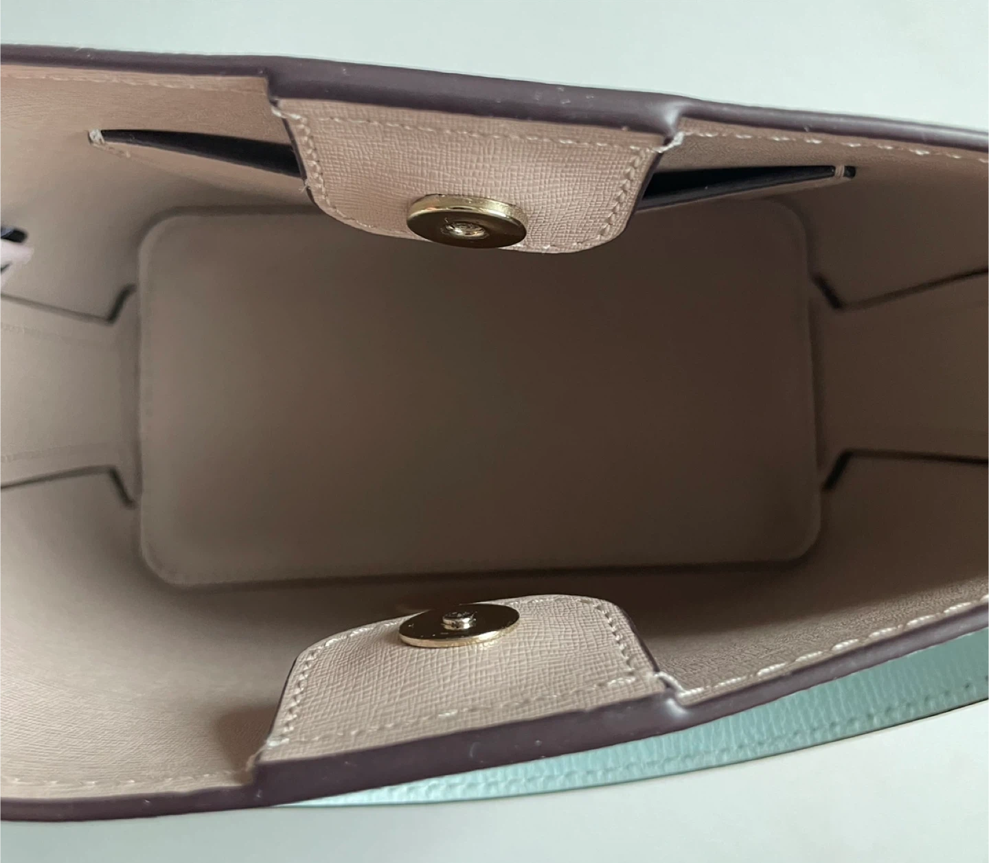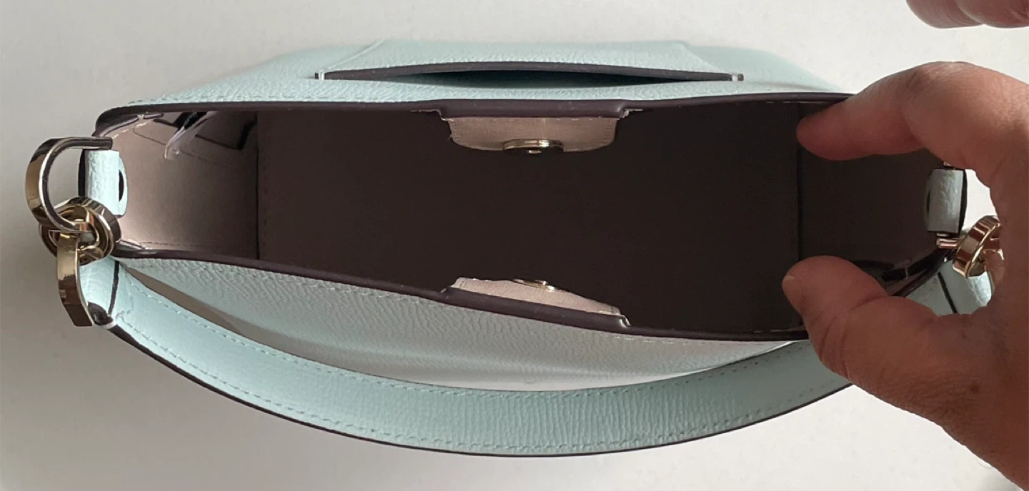 This item is made from refined grain leather, and it features an exterior front slip pocket, an interior back slip pocket and a magnetic snap closure. Additionally, the bag has a handle and shoulder strap, which are approximately 6” and 19” inches, approximately.