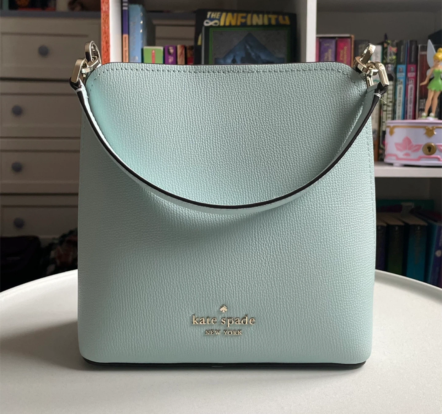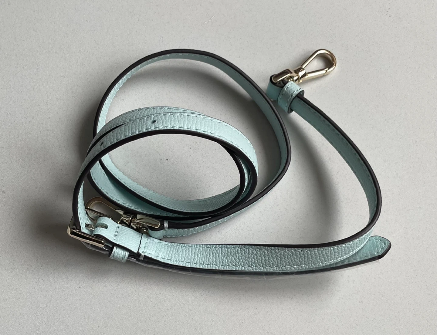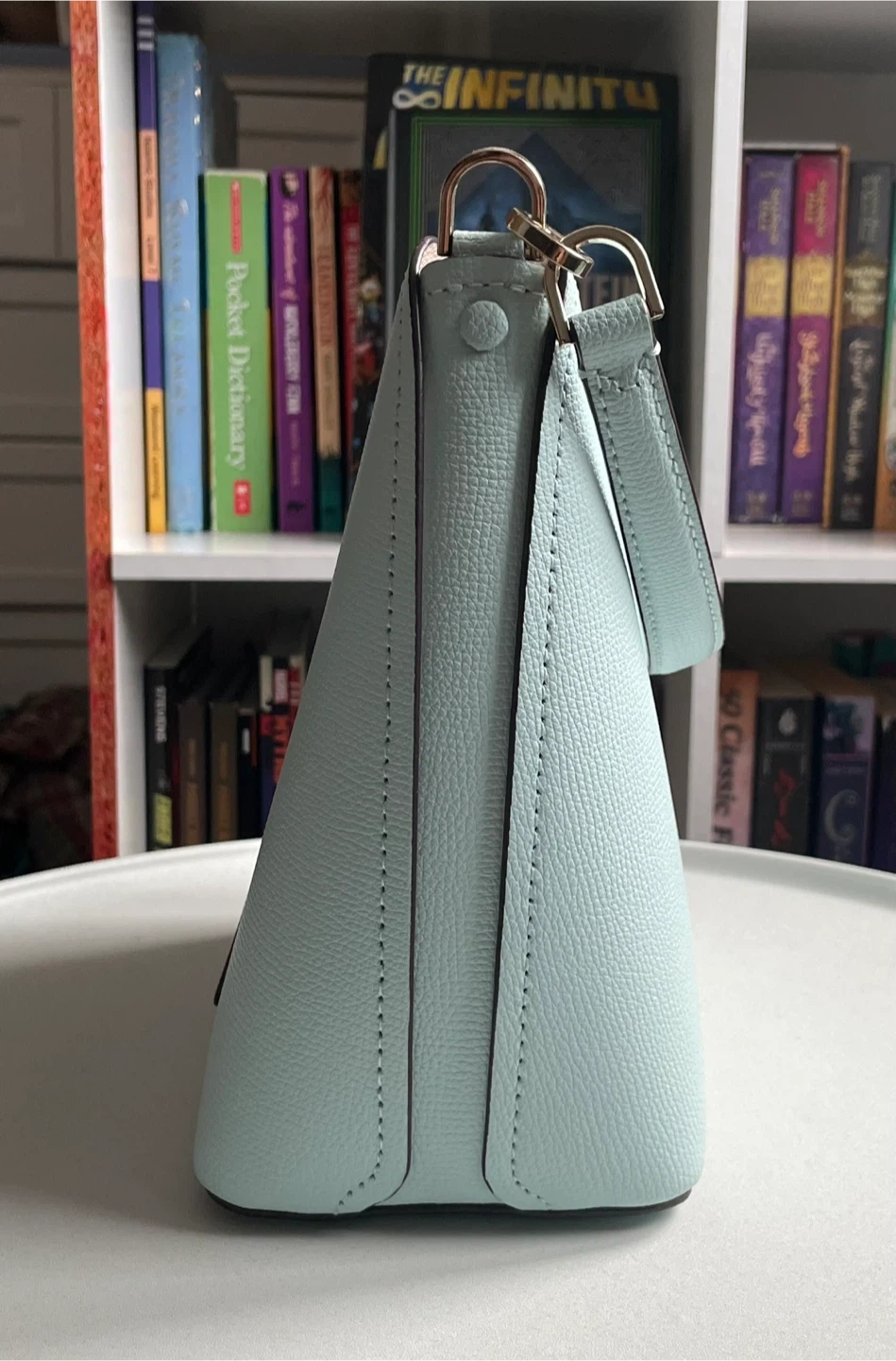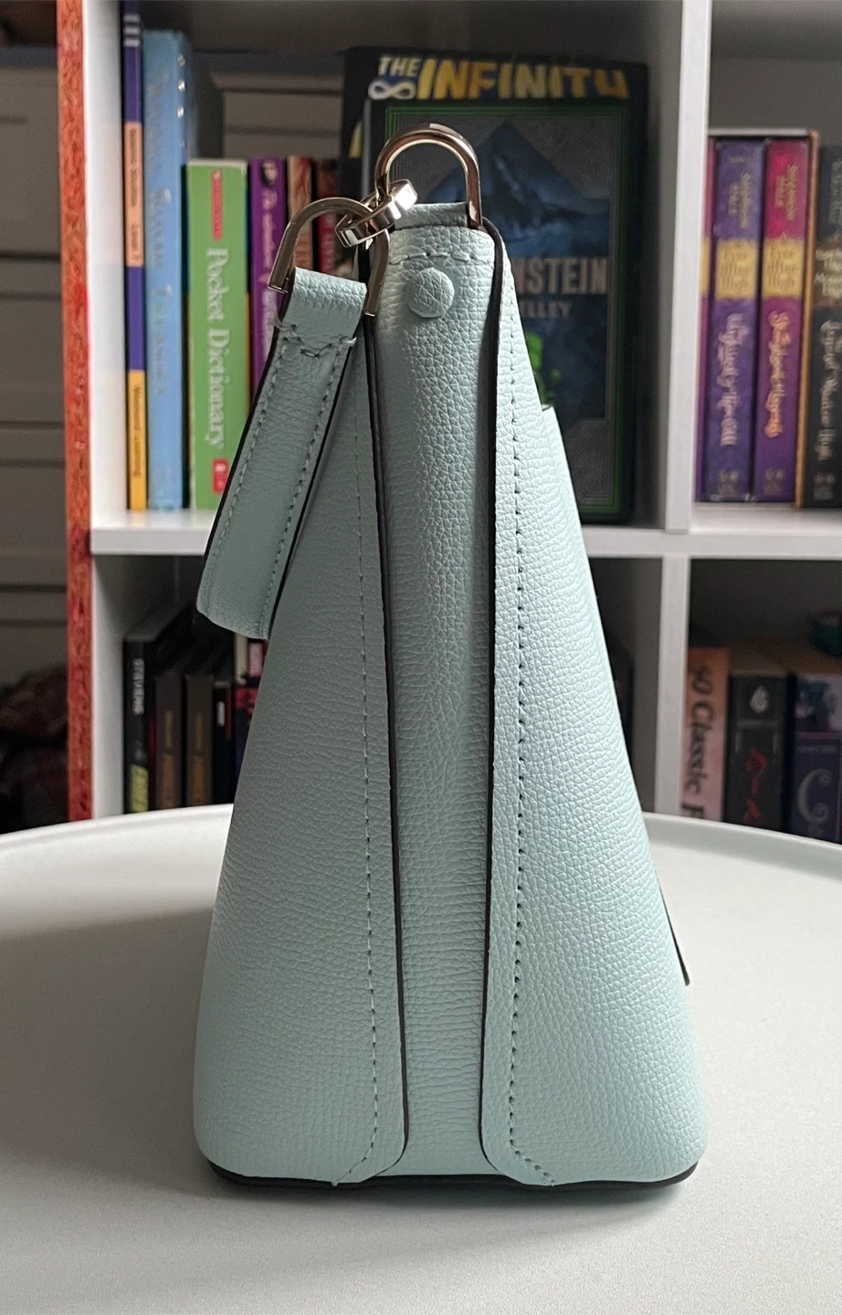 This item is made from refined grain leather, and it features an exterior front slip pocket, an interior back slip pocket and a magnetic snap closure. Additionally, the bag has a handle and shoulder strap, which are approximately 6” and 19” inches, approximately.