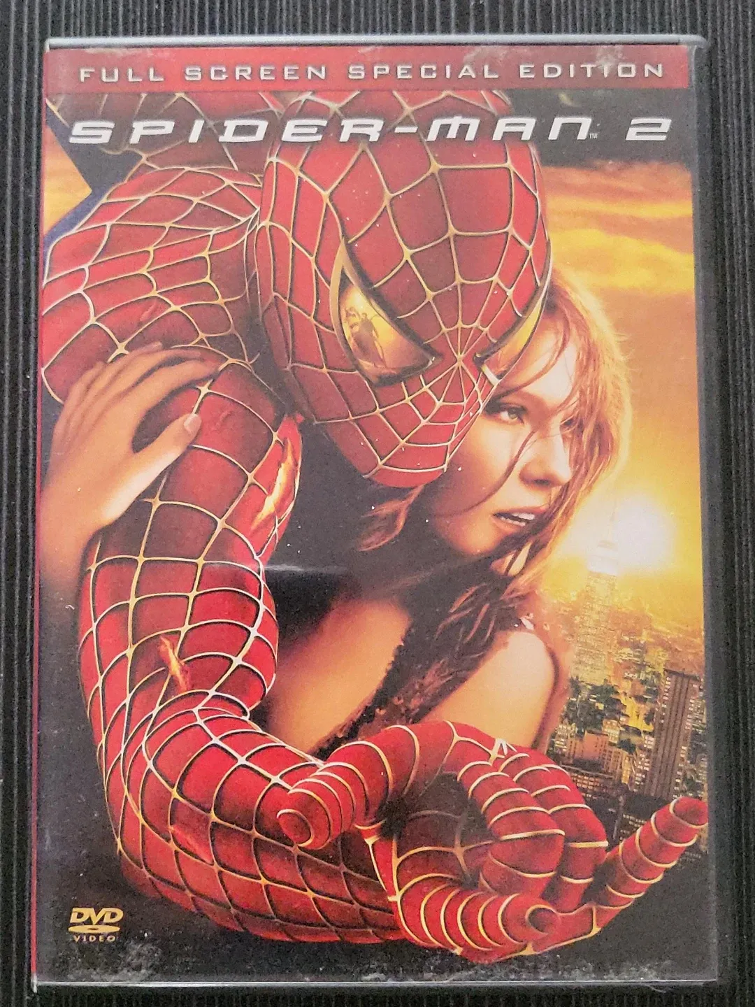 This is the "Full Screen Special Edition" of Spider-Man 2 on DVD. It's a two-disc set with "Disc 1" featuring the main film and "Disc 2" containing special features. The set includes commentary, behind-the-scenes documentaries, and more.