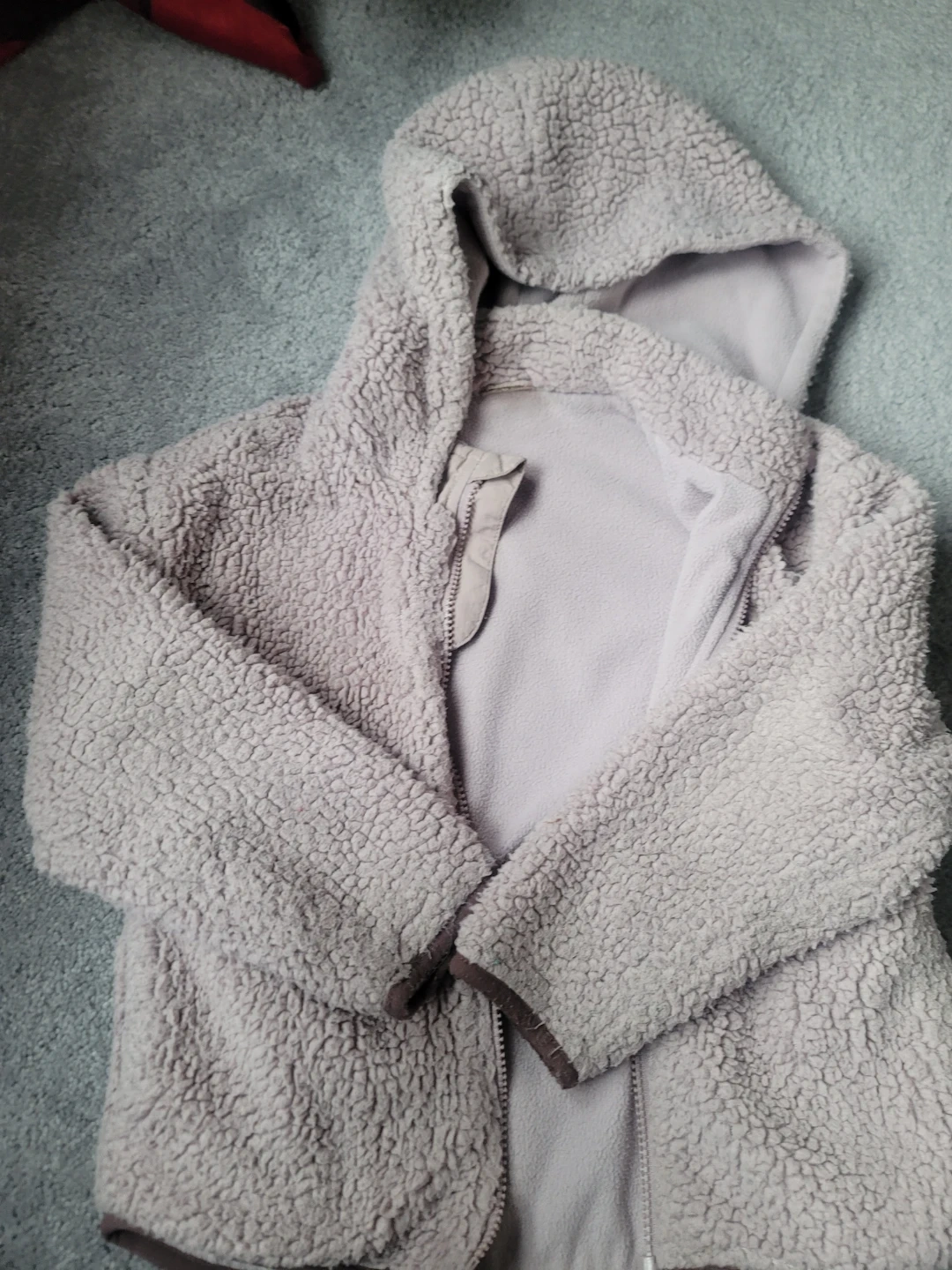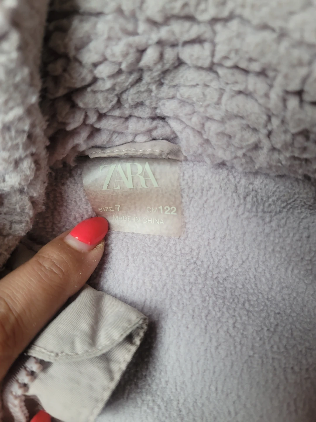 Cozy Zara fleece hooded jacket in a light purple colour. It's a size 7 (CM122) and made in China. This soft jacket is great for keeping kids warm on chilly days!
