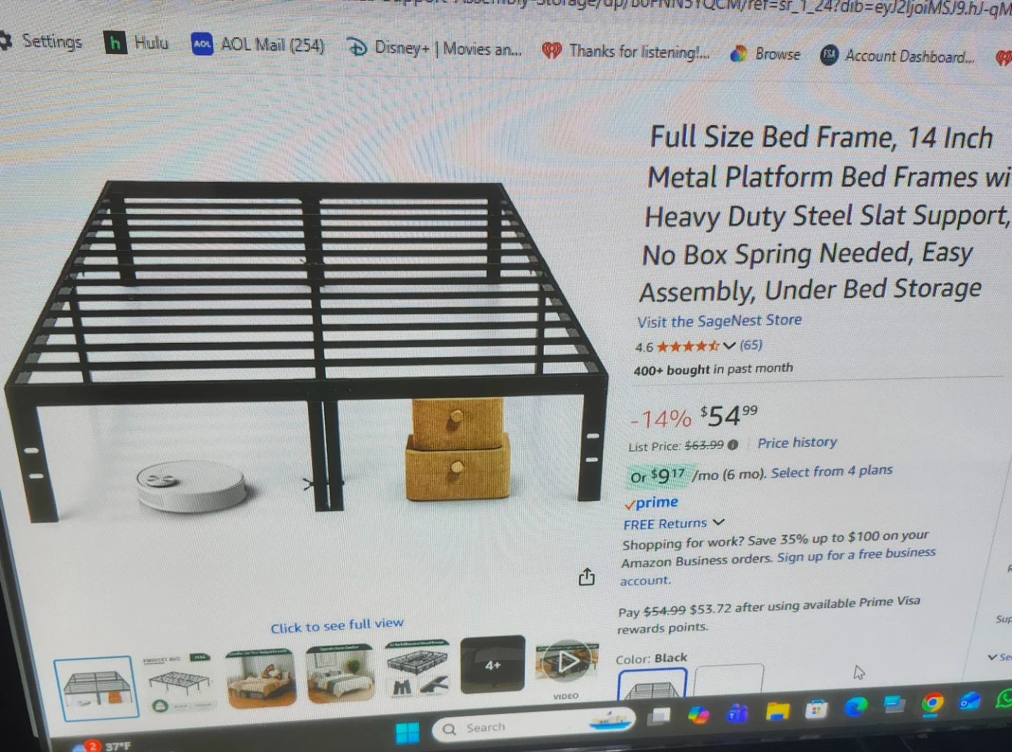 Selling a full-size bed frame made of black metal. This is a 14-inch metal platform bed frame with heavy-duty steel slat support. It's designed so no box spring is needed, and it's easy to assemble with under-bed storage, available for a great price!
